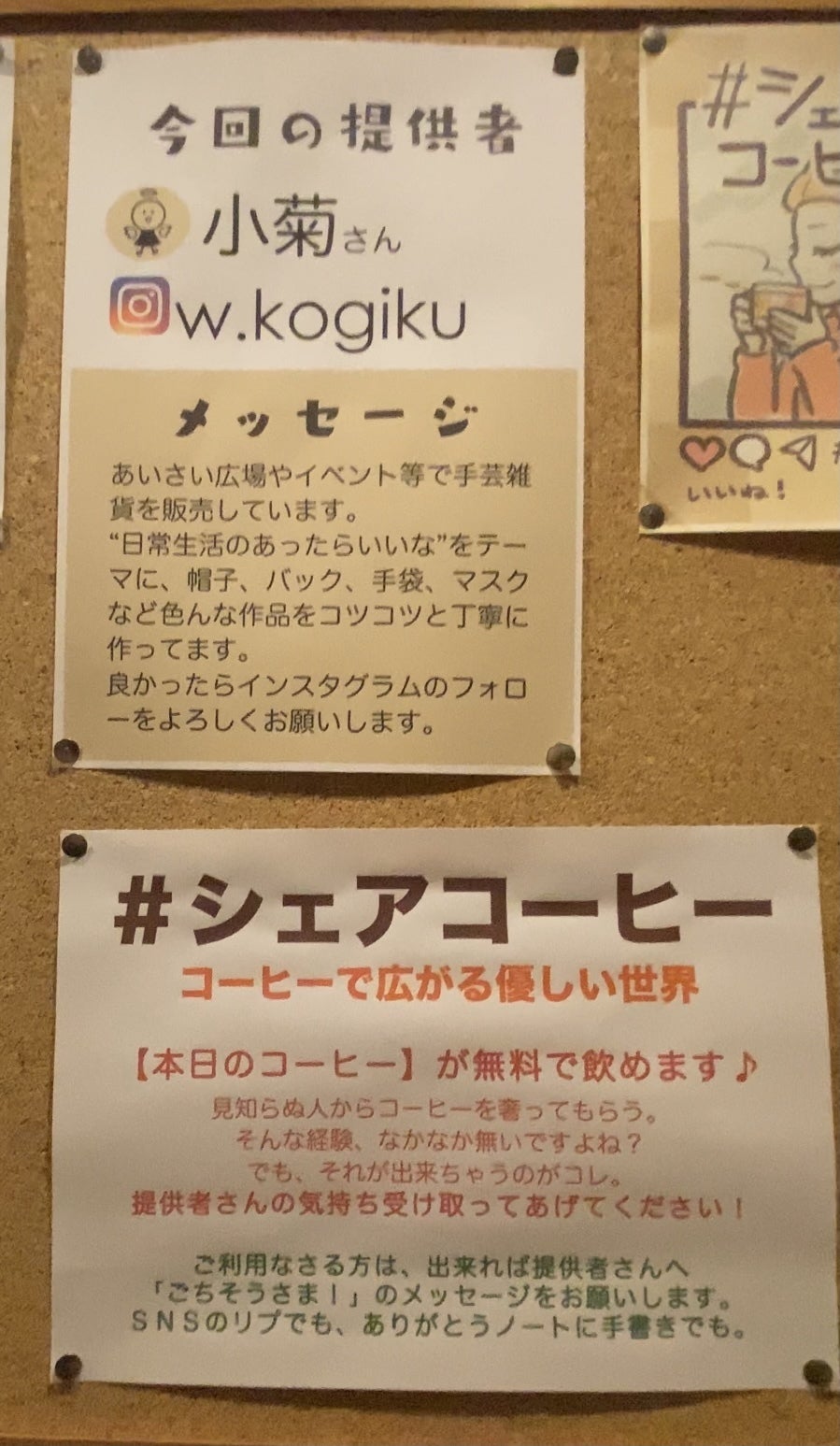 東根さん:じゃあうちには何があるかな?って考えたらコーヒー券だったんよ。ただコーヒーは大人の飲み物やしどうしたもんかなーって考えたら、うちに来てくれたシングルの保護者さんとか子育て中のママさんにコーヒー代浮かせるぐらいの支援になるんじゃないかなと思って。使った人にはSNSでお礼を呟いて貰うかメッセージノートにお礼を書いてもらうんやけどそのお礼メッセージを見て『やりたい』『もう1回やる!』て言ってくれたりしてる人もいる。