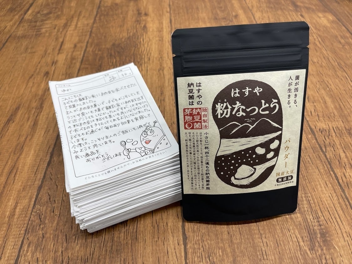 元々菌床椎茸の事業をしていたこともあって、今製造販売している「はすやの粉なっとう」ができたんです。