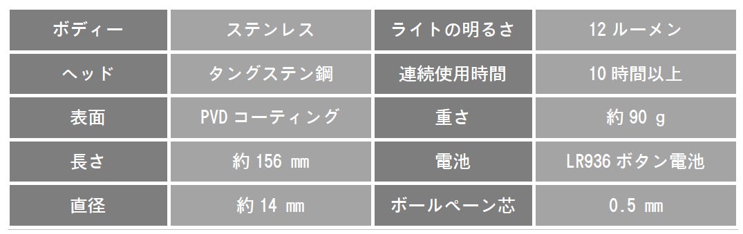 とてもなめらかに書けるボールペン芯を搭載し、握りやすいボディーと重厚感のあるステンレス素材は使い心地抜群です。普段は筆記具として携帯し、サインやちょっとしたメモに便利です。