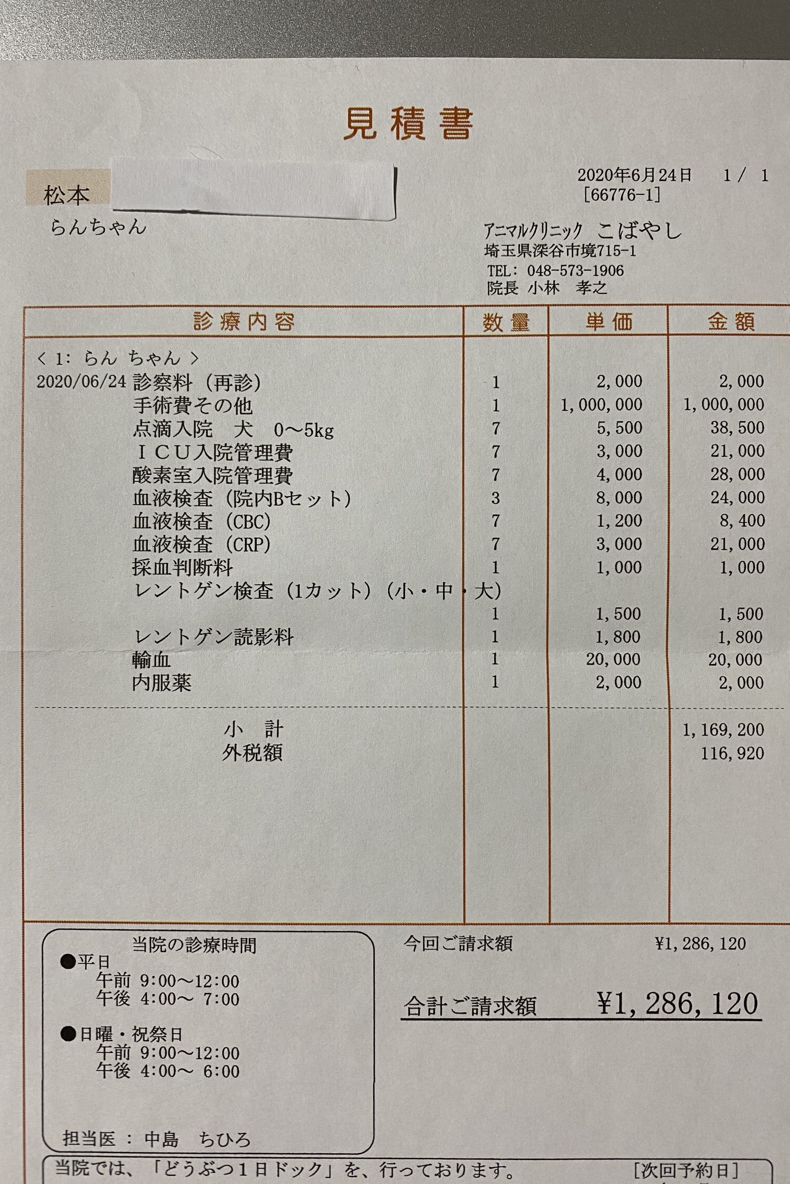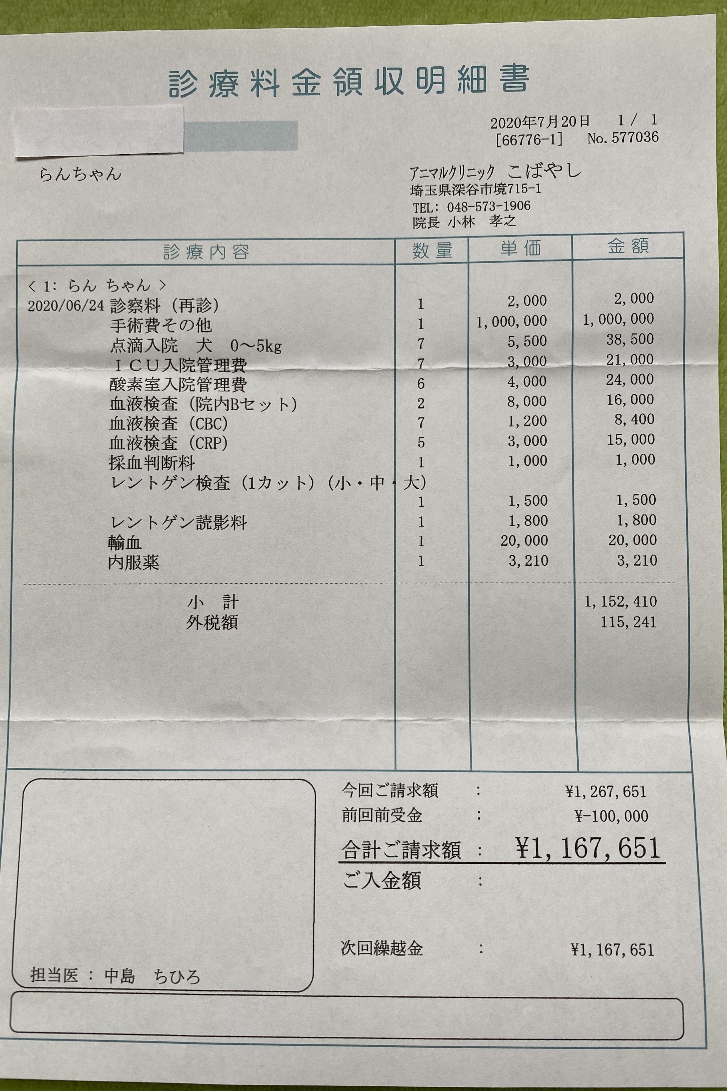 2020/07/25 14:18明細となります。ランちゃんはいなくなってしまいましたが手術費用は支払わなければならないので引き続きご支援ご協力よろしくお願い致します。 もっと見る