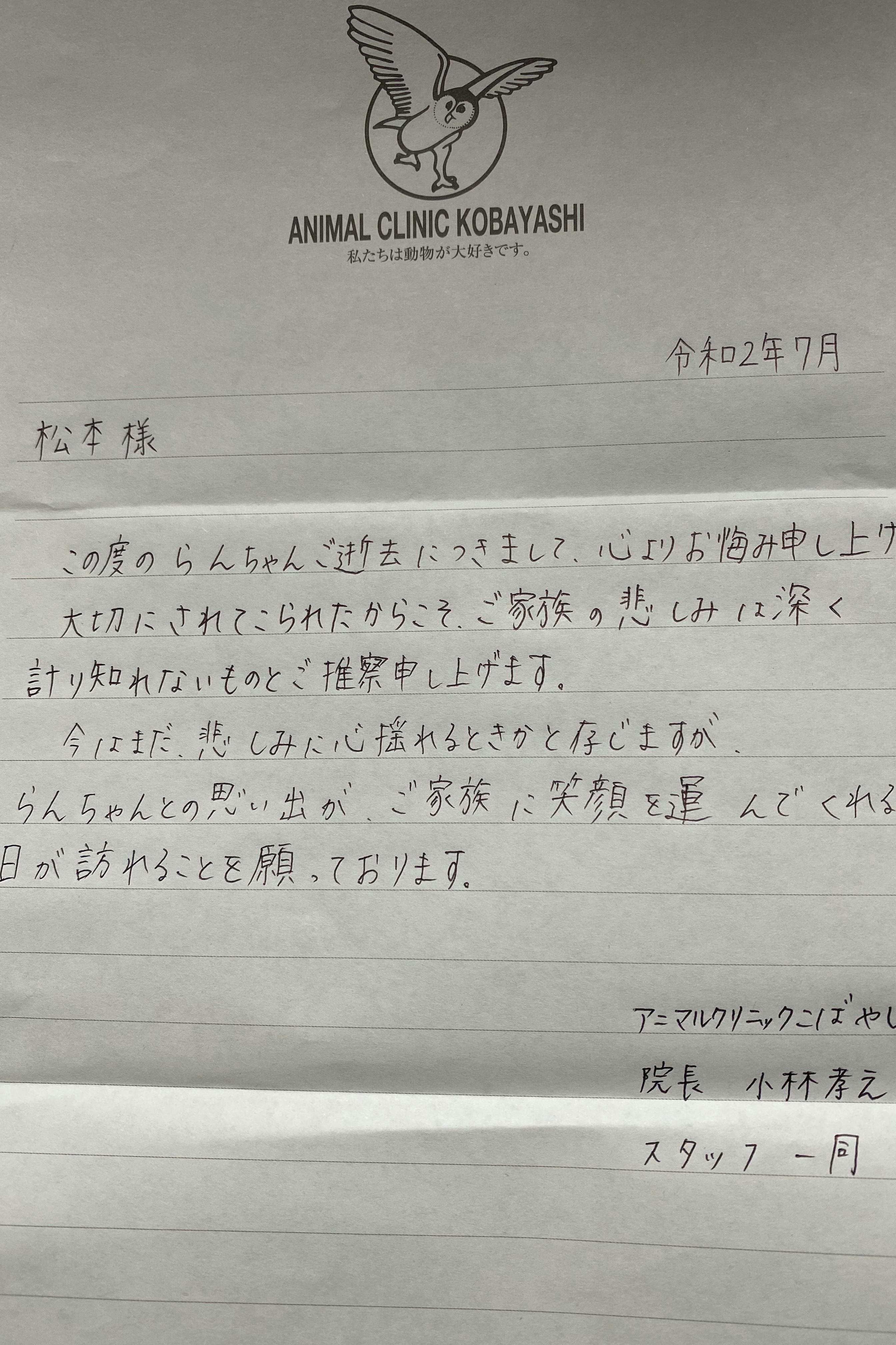 ランちゃんは優しい先生に看取ってもらえたんだなぁ。とありがたかったです。