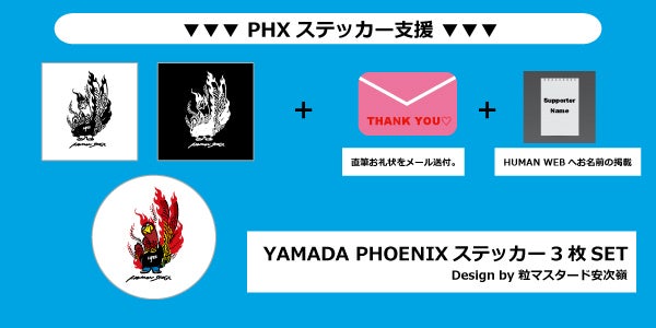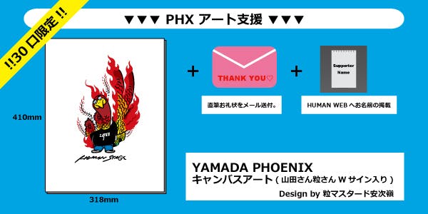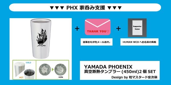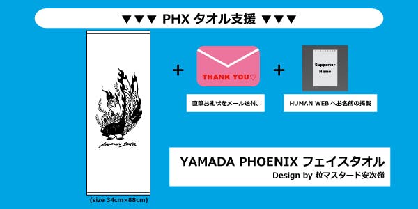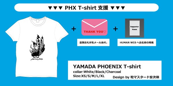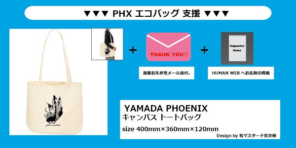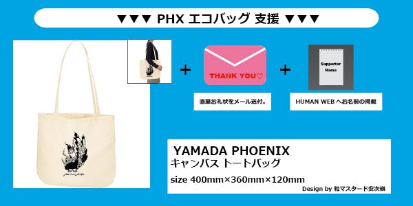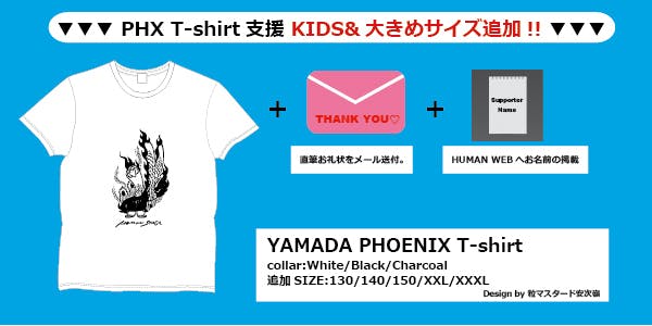 2020/07/31 18:45本当に多くのご支援ありがとうございます!!本プロジェクトも残すところあと僅か、8/2(日)23:59迄となりました。リクエストも頂きました、"T-shirtキッズ&大きめサイズ""トートバッグ"の新リターンを追加しました!!また、HUMAN STAGE最後の日の2つの映像も公開◎最後までご支援・拡散を宜しくお願いいたします‼●PHX T-shirt支援 キッズ&大きめサイズ追加!!シンプルにフロントにYAMADA PHOENIXをレイアウト。3色お好きな色をお選び下さい◎(【Color】:White / Black / Charcoal 【Size】:130 / 140 / 150 / XXL / XXXL )●PHX エコバッグ支援シンプルなキャンバストートバッグにYAMADA PHXをレイアウト◎■動画公開!!▼HUMAN STAGE最後の日https://www.youtube.com/watch?v=Es4yYudsJzI▼『小さな恋のうた』UKULELE GYPSY(キヨサク from MONGOL800) / HUMAN LAST LIVEhttps://www.youtube.com/watch?v=2fdX1dJwqsk『"優しいうたは 世界を変える"僕は歌のチカラを信じます』山田さんは最後の挨拶でそう言いました。そんな山田さんの言葉を信じます‼重ねまして、最後まで宜しくお願いいたします。 もっと見る
