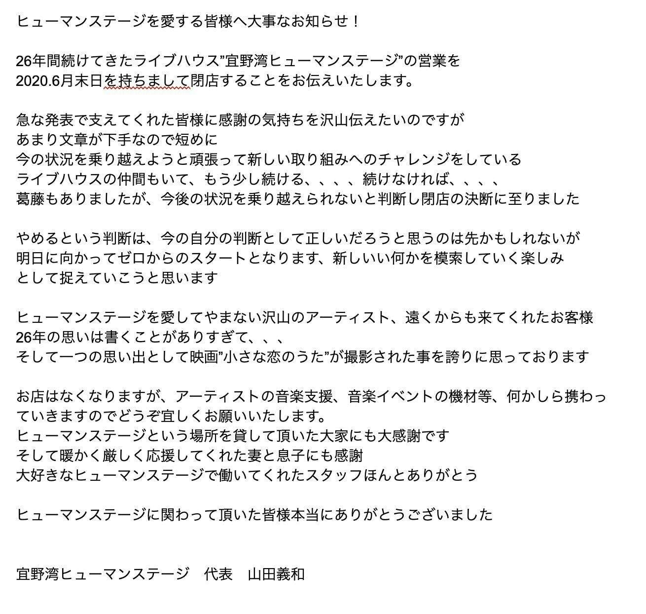6月10日、代表山田さんのSNSよりHUMAN STAGE閉店のお知らせが発表されました。