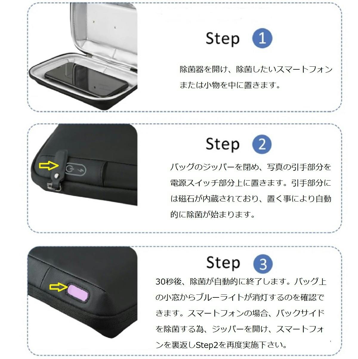 除菌を開始して30秒で自動的に停止します。バッグ上にWindow(小窓)があり、除菌中という表示であるブルーライトを確認できます。30秒後にブルーライト表示が停止する事で、除菌終了を知らせます。また第三社外部機関で実施されたテスト結果からも、30秒での99.9%以上の除菌効果を実証できています。薄型のバッグを採用する事により、UV-C波を発生させるLEDから除菌対象物までの距離を短くし、高出力LEDの使用と合わせて、短時間での高い除菌効果を実現しています。