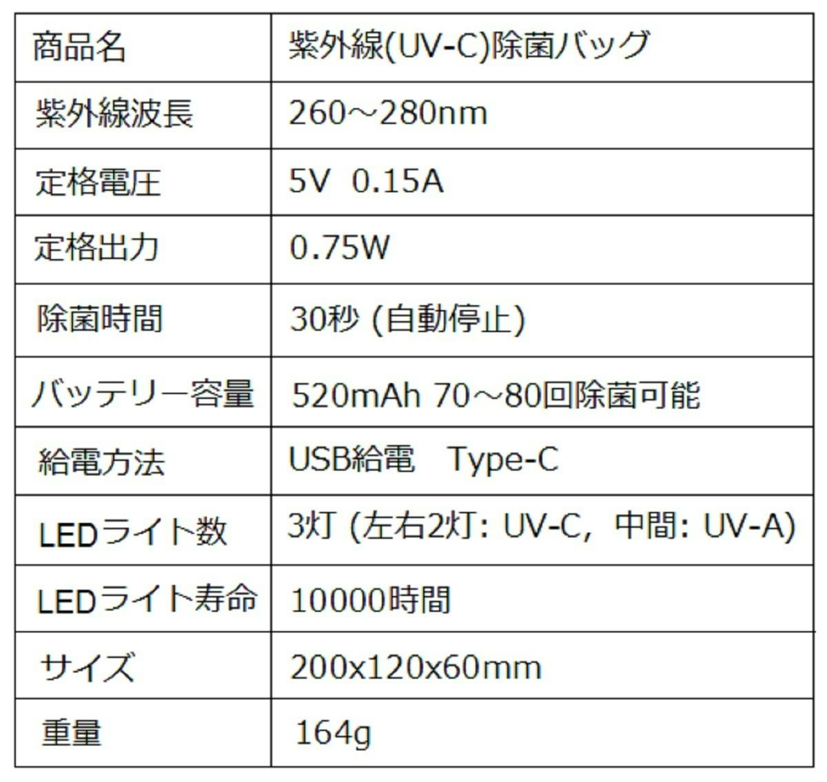 まとめますと、以下の特長があるUV-C除菌バッグです。