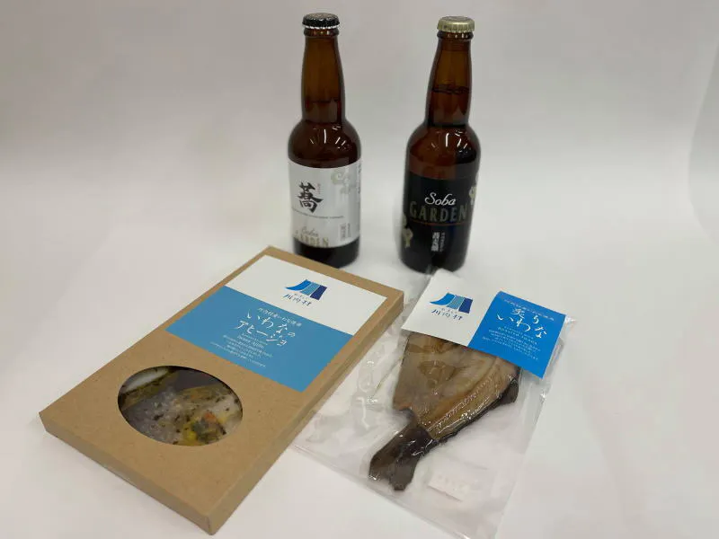 ー ビール、いわなセットA(蕎 、GARDEN、各1本、ジャーキー、燻製、各1個)
