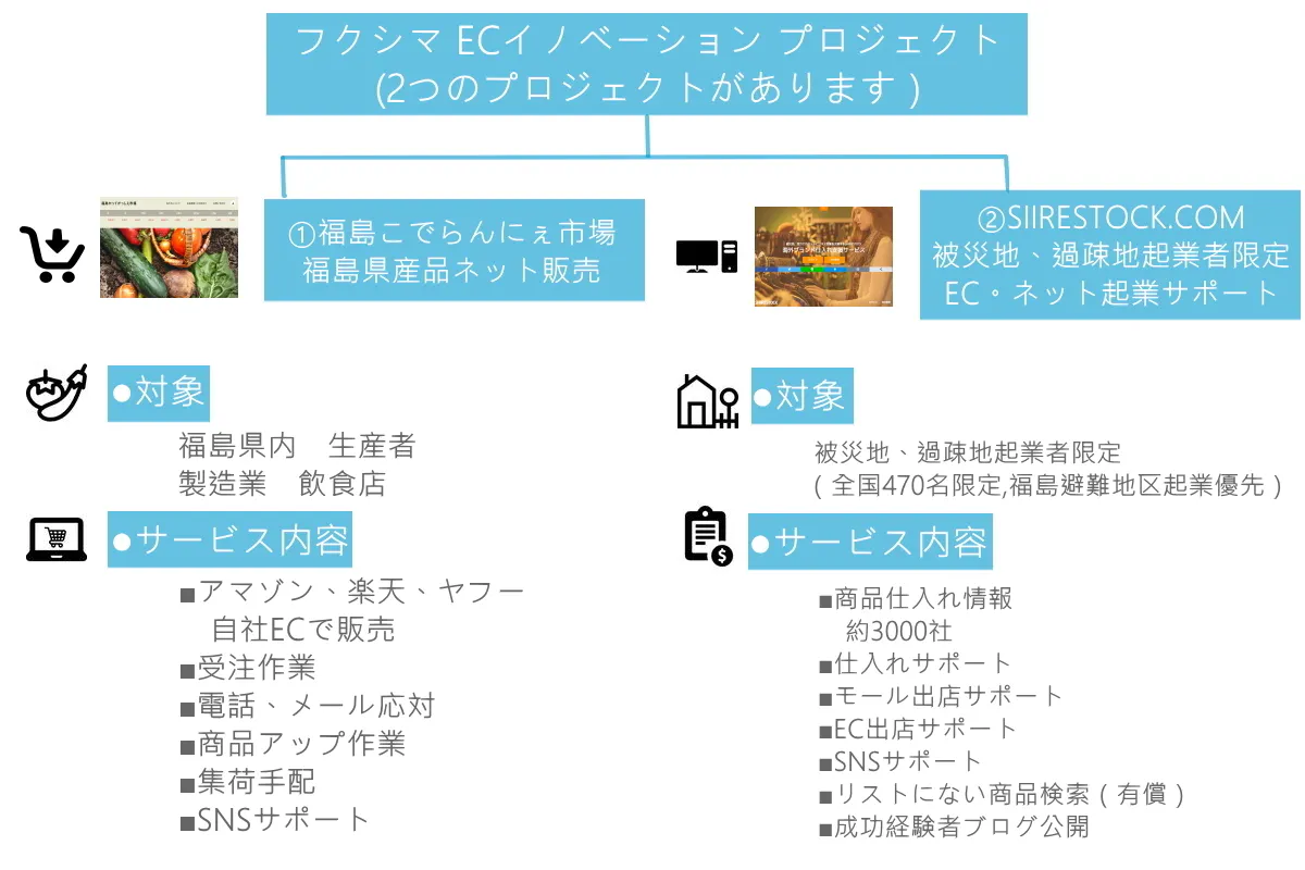 具体的な内容は、福島原発近郊の避難12市町村産の農水産物を皮切りに福島産製品をインターネット販売(アマゾン、楽天、ヤフー、自社EC)で国内外に情報発信、販売します。