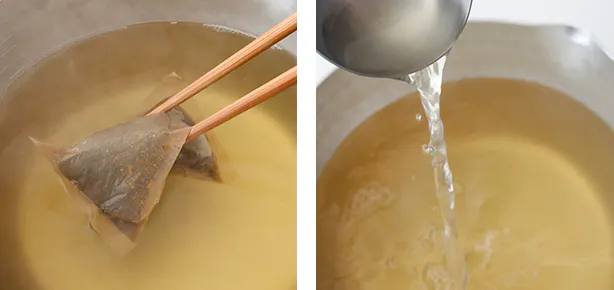本製品の特長は、製造工程に置いて一度キチンと「だし」を取っているということ。一般的なだしパックは、風味原料であるかつおや昆布を粉砕し、塩や砂糖、その他各種エキスや調味料等を加えて作られています。
