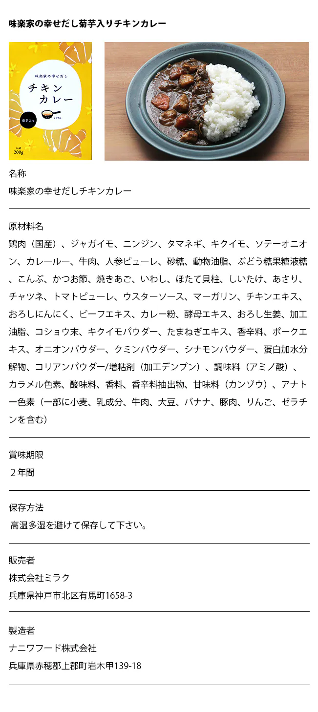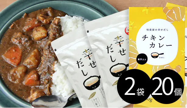 味楽家の幸せだしを使用した 菊芋入り味楽家の幸せだしチキンカレー20個と味楽家の幸せだし12パック入り2袋のセット