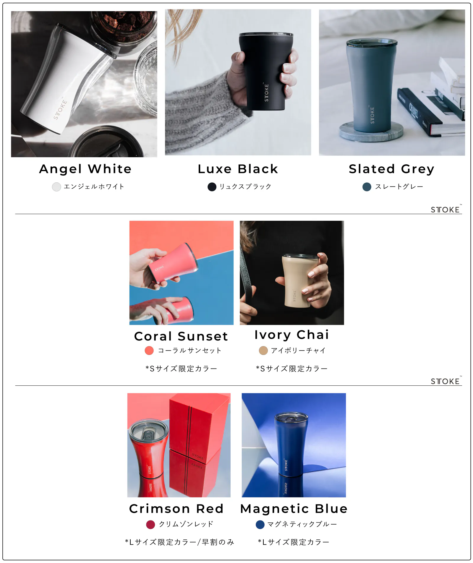 力強い原色の「クリムゾンレッド」「マグネティックブルー」はLサイズ限定のカラーです。*クリムゾンレッドは早割限定で24個のみなのでお見逃しなく!