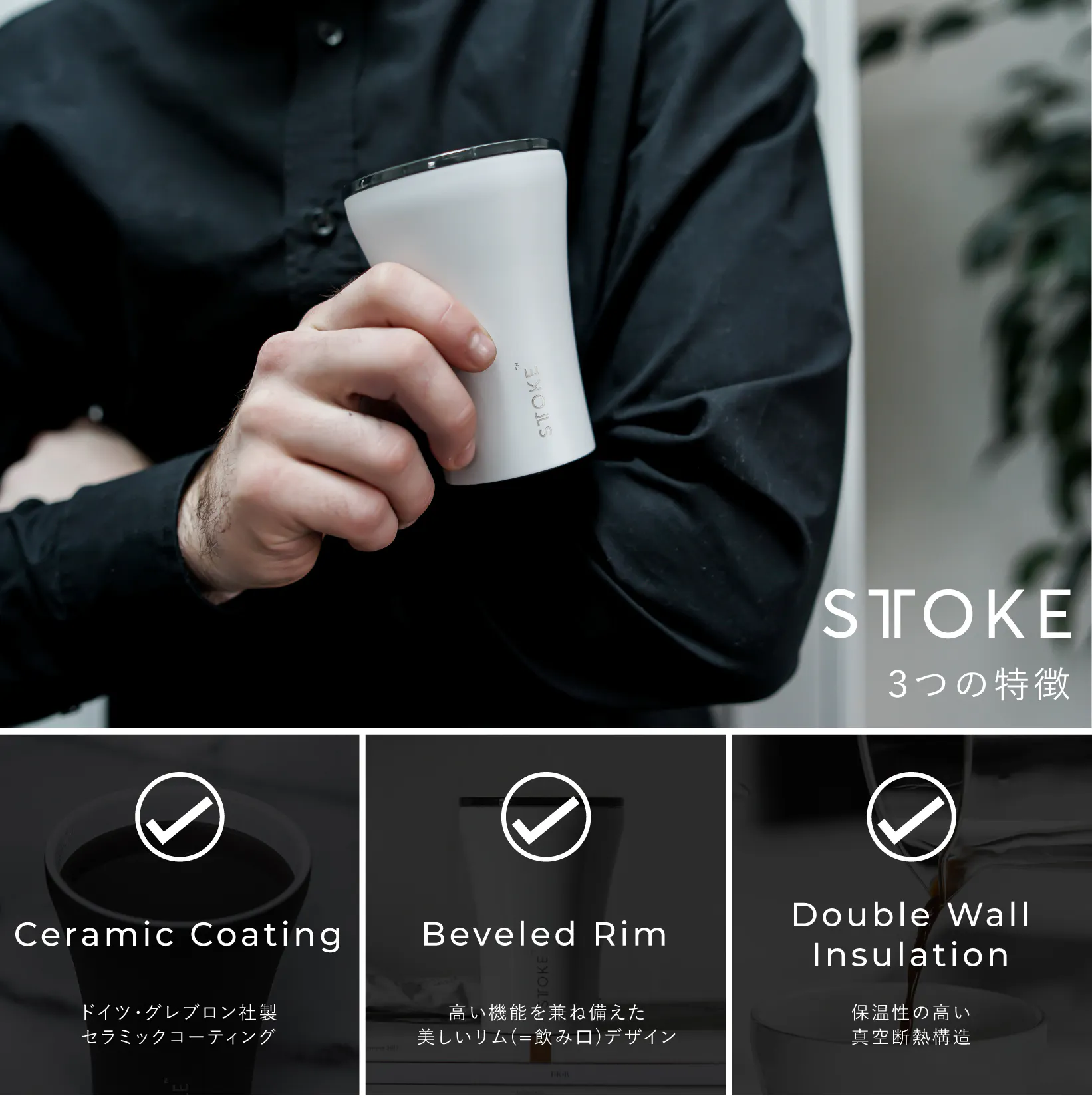 「STTOKE(ストーク)」は、オーストラリアで生まれた、二重断熱構造の新進気鋭のサーマルカップです。ステンレス素材をベースに、内側には陶器と同等の効果を持つセラミックコーティングを施しています。