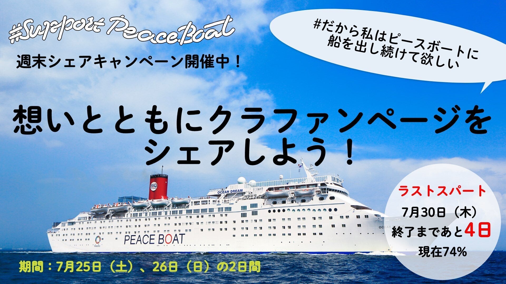 その際に「#だから私はピースボートに船を出し続けて欲しい」というあなたの想いを添えていただけると嬉しいです。