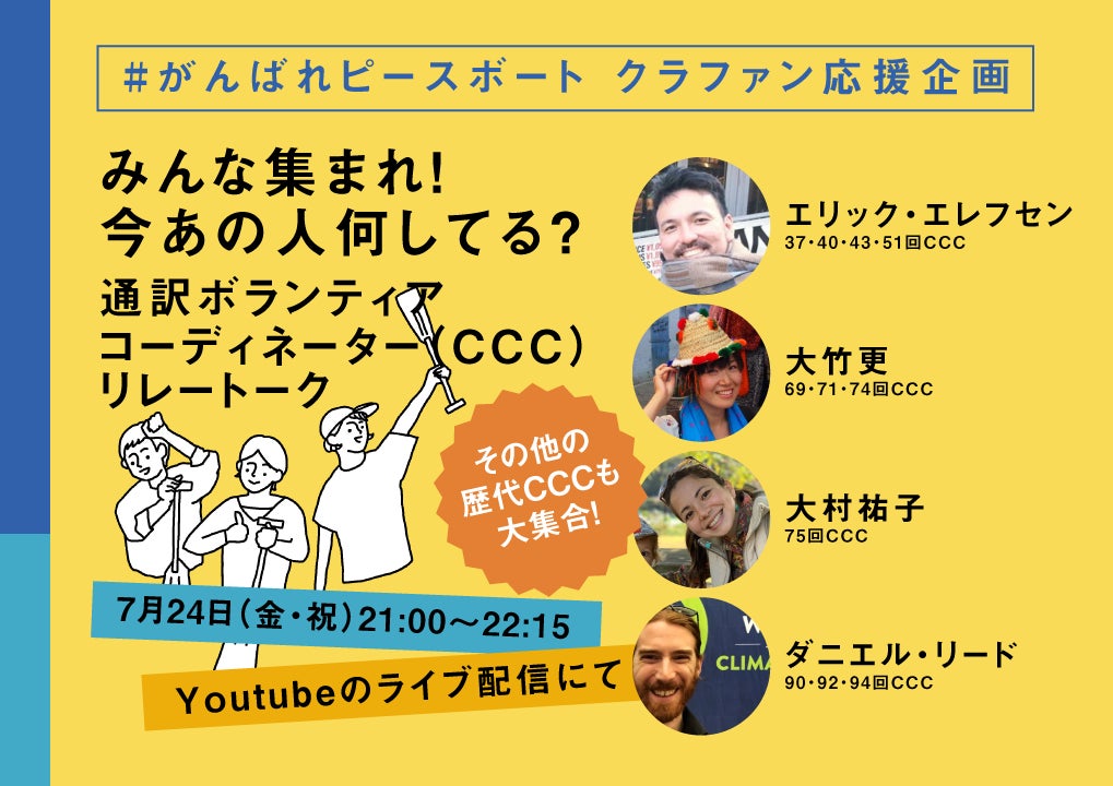 7月19日(日)の夜に「提供者がリターンを紹介します!presented by過去乗船者有志メンバー」ということで、元ピースボートスタッフ7名が出演し、ピースボートでの思い出や退職後の針路についても触れながら、それぞれが持ち寄ったリターンについて紹介してくれました。"元スタッフも、ピースボートにはすごく感謝していて、恩返ししたいと思っている人がたくさんいる。元スタッフも船で人生が変わったという人がほとんどだと思うので、ピースボートには続いていってほしい。最大限応援しようと思っています。"(阪田理沙)"ピースボートと私は、「世界の平和を目指す」という根っこの部分は同じで、方法が違うだけ。同志だと勝手に思っています。"(塩山千恵子)"ピースボートは懐がでかい。乗船者もスタッフも本当に幅が広い。経歴や肩書に関係ないところで人と付き合うことを実践できる。言葉で聞くと当たり前のように感じるけれど、それを体感できることは大きいと思う。"(上野祥法)次々と登場する懐かしい顔ぶれのに、船を思い出した方も多かったのでは。元スタッフの皆さんのピースボート愛がひしひしと伝わってくる素敵なひとときに、こちらも勇気づけられました。また、それぞれの想いのこもったリターンのお話があったおかげでさっそく購入いただけた方もいます!↓↓アーカイブ視聴はコチラ↓↓https://youtu.be/qegXkjazMKs