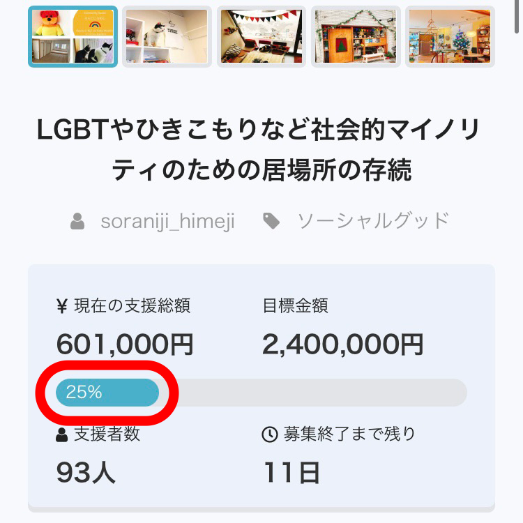 達成率が25%に届きました。93名ものかたがたからご支援をいただきました。本当にありがとうございます。目標金額は家賃2年分の240万円ですが、クラウドファンディングはあと11日、なんとか達成率50%の120万円、家賃1年分に届きたい!お願いします!!