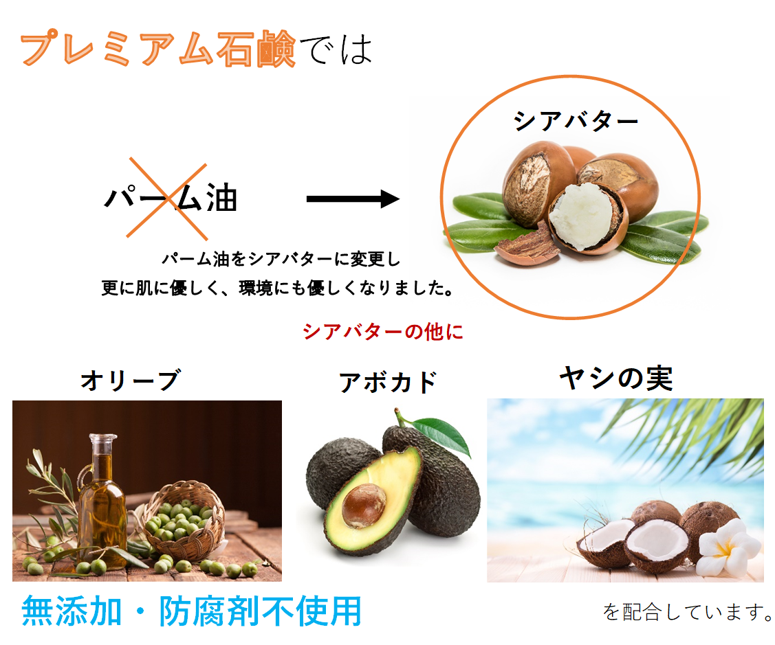 弊社では既にクレイ石鹸を販売していますが、その原料となる精油(パーム油)は、アブラヤシという植物から採れる植物油です。アブラヤシを育てる農園では、熱帯雨林の樹木を大量に伐採する必要があるため、森林破壊・自然破壊など様々な問題が起こっています。しかし、弊社がプレミアム石鹸で使用する「シアバター」はアメリカ大陸に自生しているシアの実から精製する為、樹木の伐採などがなく、森林破壊・自然破壊に繋がることなく精油を採取する事が可能です。