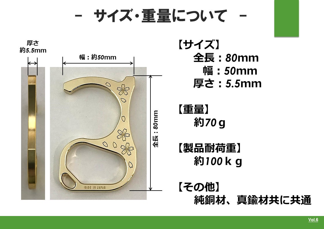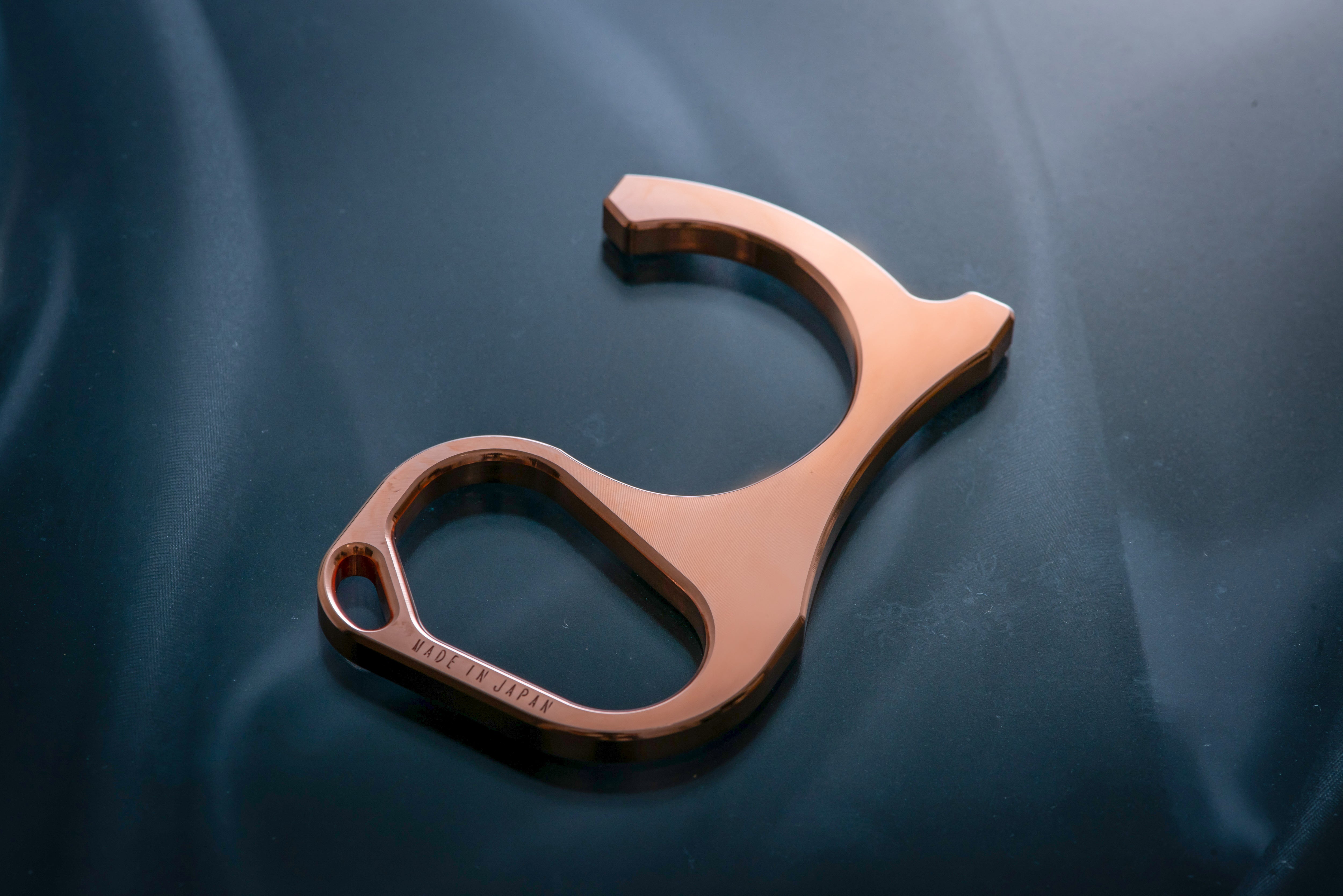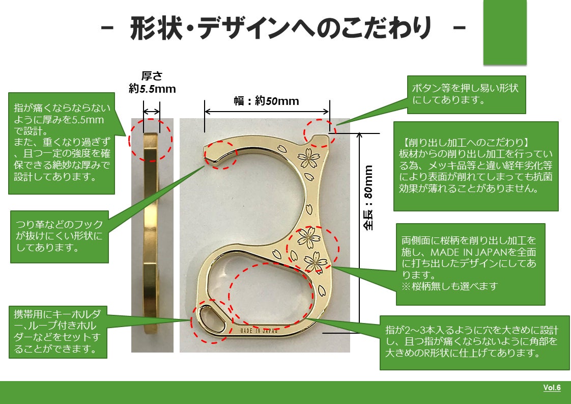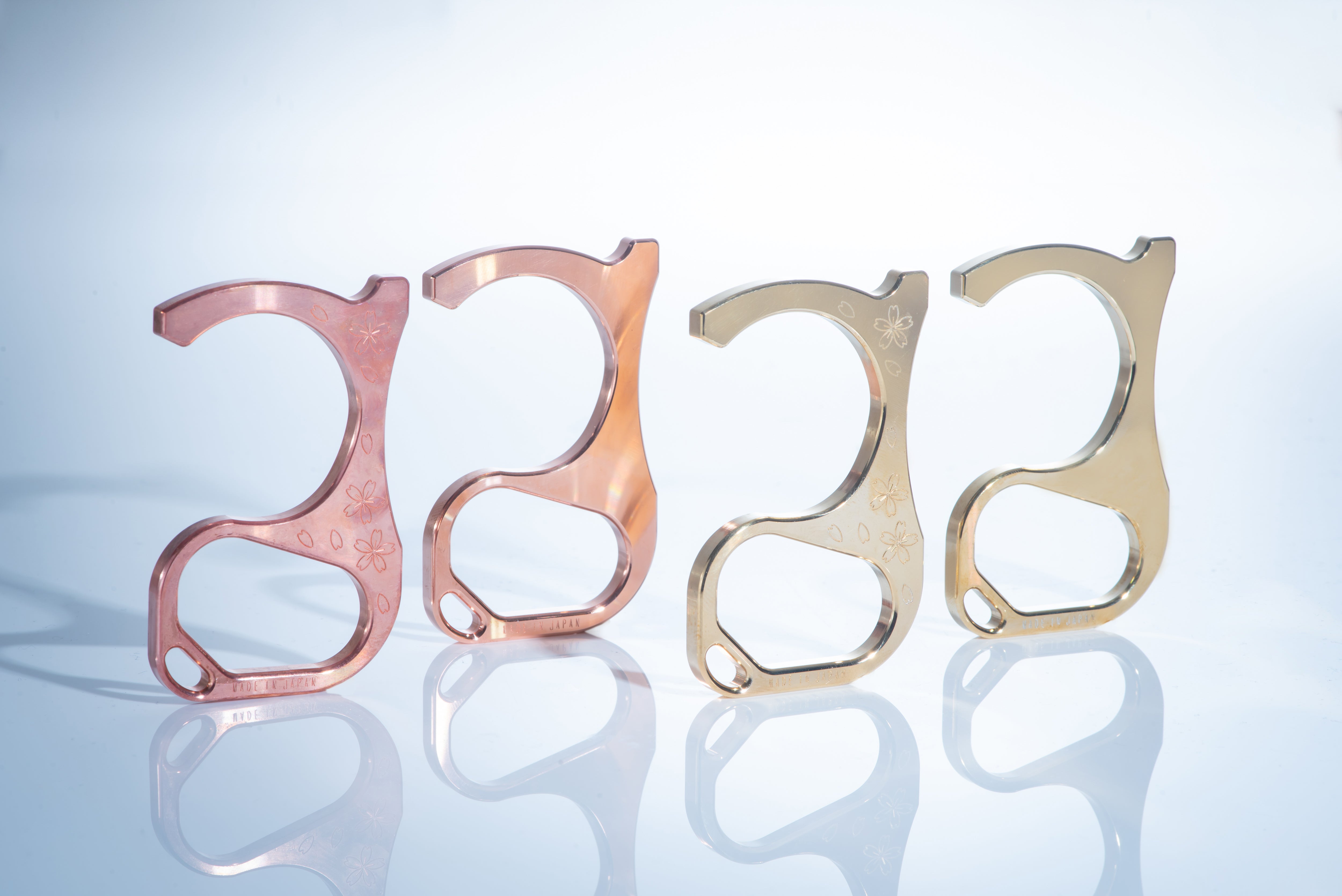 2020/07/09 11:007月に入り、「アシストフック」、「ドアオープナー」、「ノータッチフック」といった類似商品を見る機会が一段と増えました。中には樹脂で作られたものや、表面にメッキ処理や塗装を施してカラフルに仕上げているものもあり、抗菌・抗ウィルス効果の無い商品も沢山出てきました。メッキ品は剥がれれば抗菌効果は無くなります。樹脂は菌が数週間滞在するとも言われてます。一方で、当社の製品は「純銅材、真鍮材」に対して「総削り加工」をしておりますので、たとえ表面に傷がついてしまったり、変色したとしても「抗菌効果が薄れることはありません。」また、当社製品の特にこだわった点は、「①デザイン性 ②厚み5.5mm設計」です。デザインに関しては「MADE IN JAPAN」を全面に打ち出したデザインにしており、海外の方へのお土産や、贈答品としてもご利用頂けます。厚み5.5mmに関しては、指が痛くならず、重くなり過ぎず、且つ一定の強度を確保出来る絶妙な厚みで設計しております。類似商品では「プレス加工品」が多く、プレス加工品では厚み5.5mを持たせることは難しく、削り出し加工でしか出来ない形状に仕上げてあります。コロナ感染の第2波が早くも押し寄せておりますが、早く終息することを祈るばかりです。 もっと見る