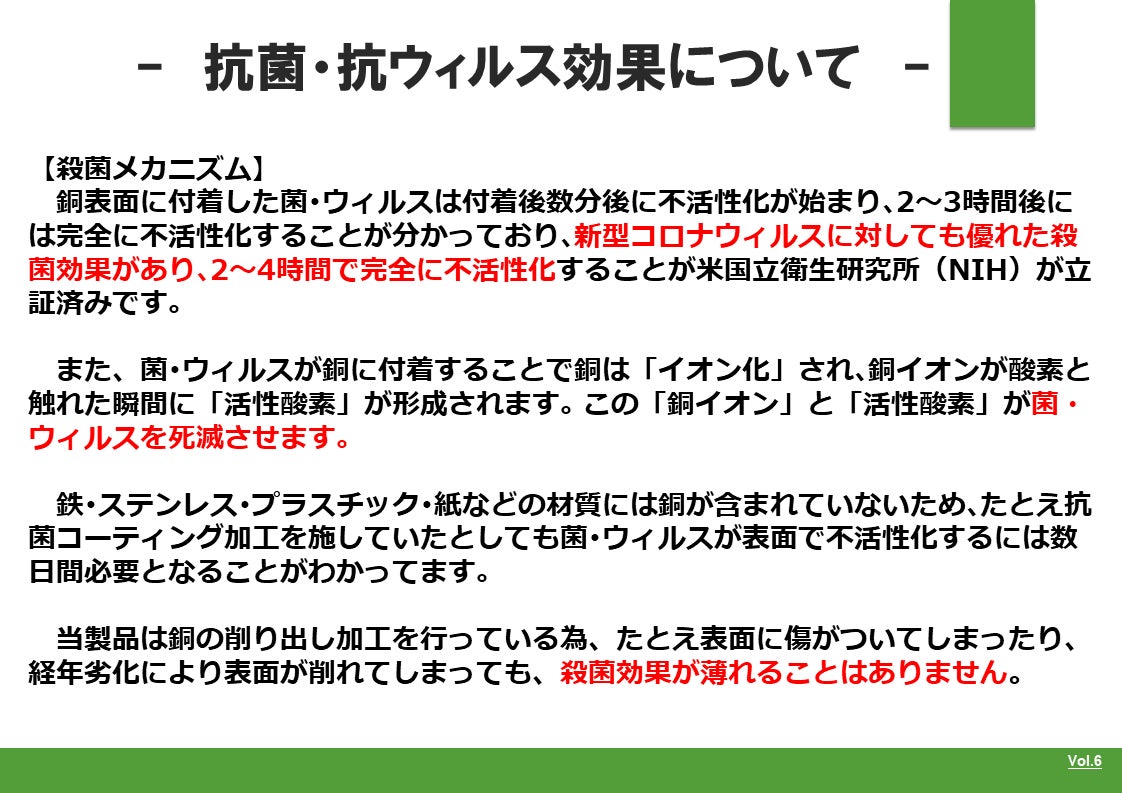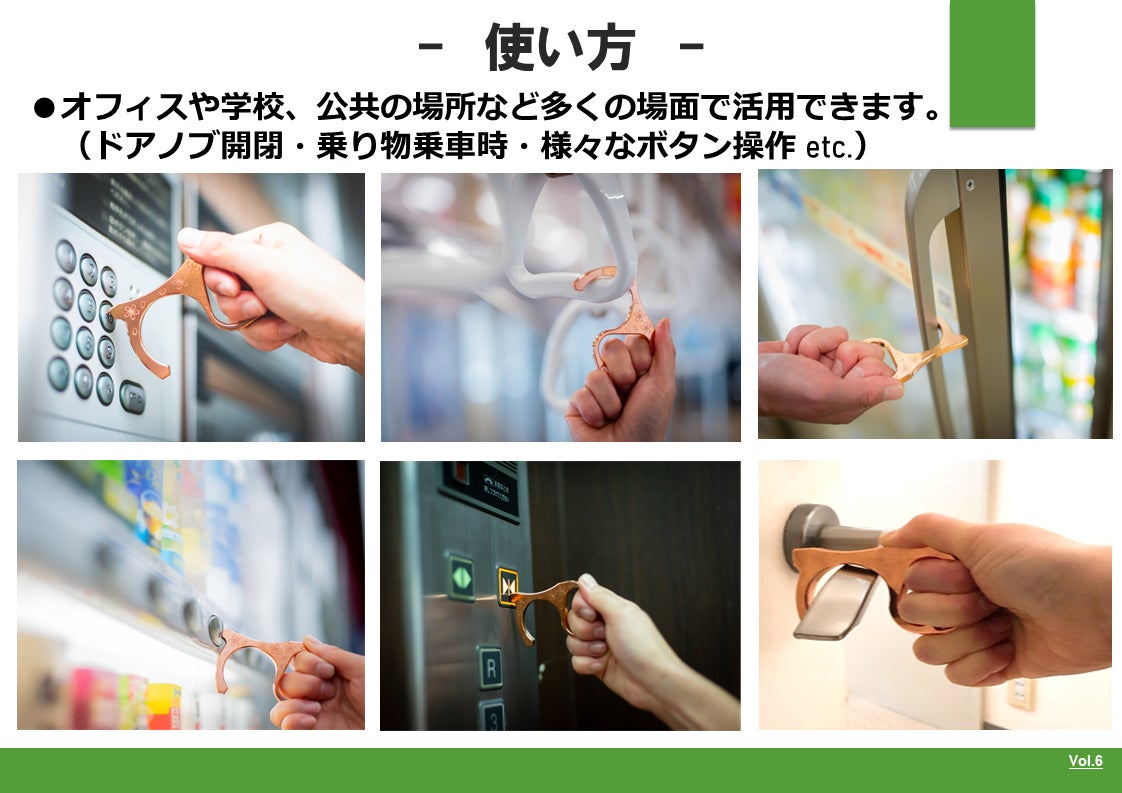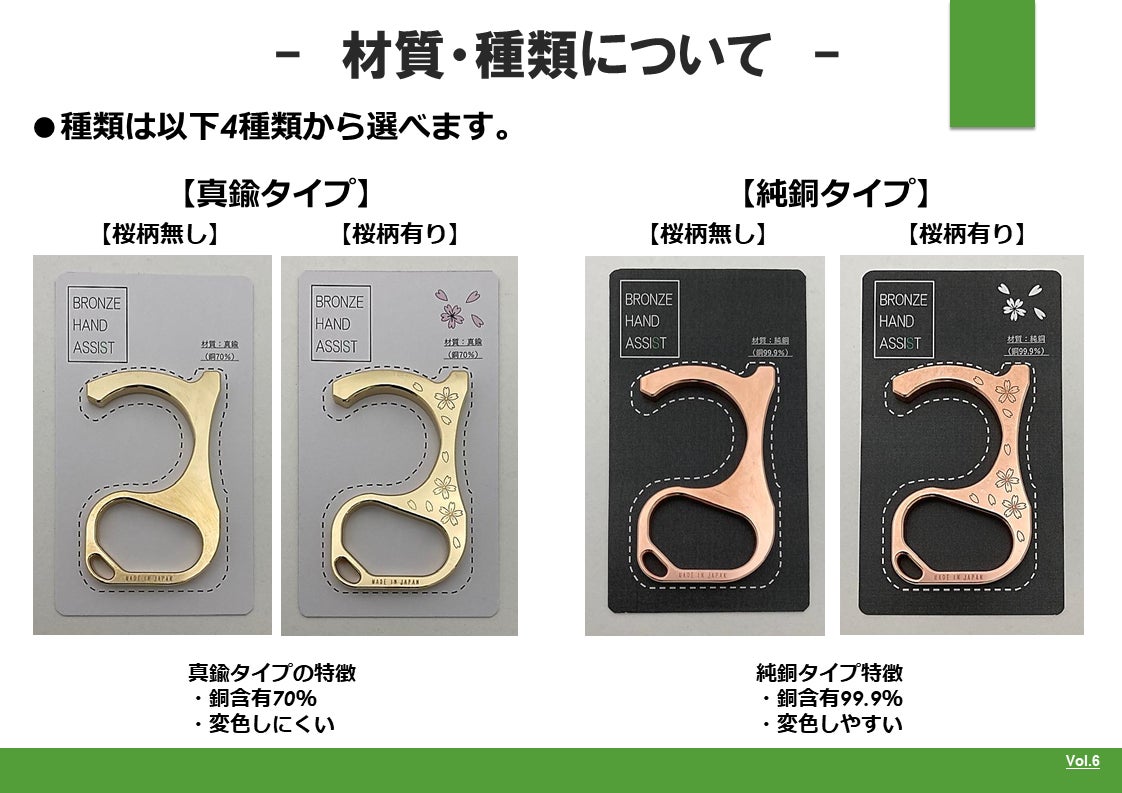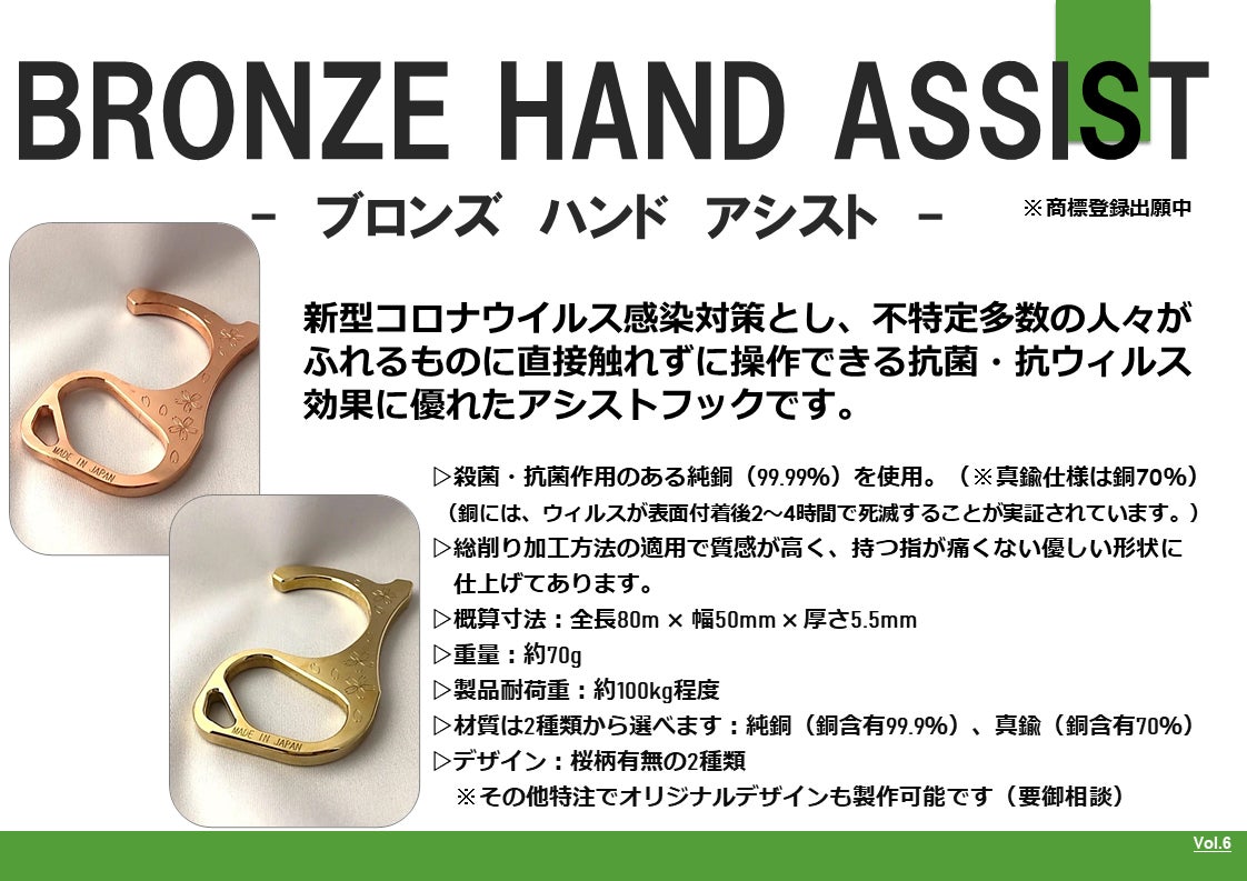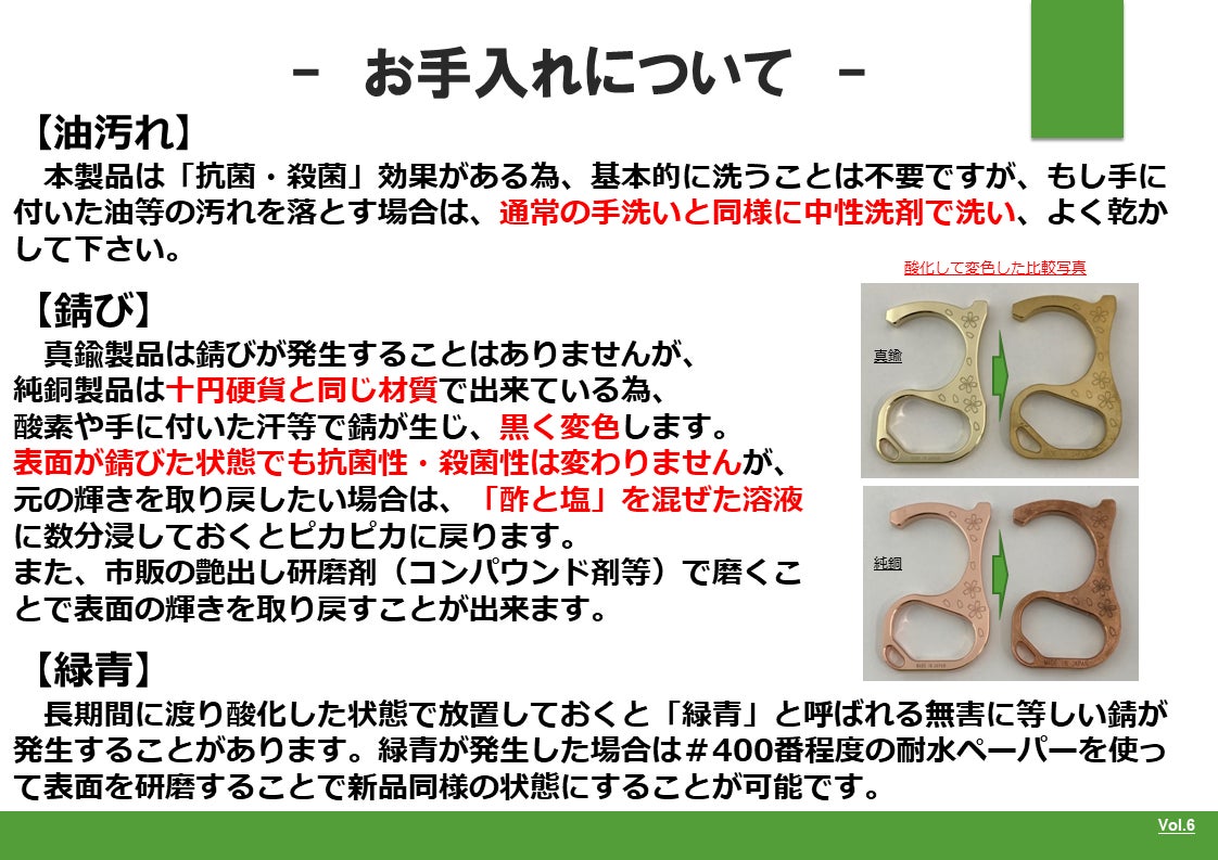 2020/07/09 11:007月に入り、「アシストフック」、「ドアオープナー」、「ノータッチフック」といった類似商品を見る機会が一段と増えました。中には樹脂で作られたものや、表面にメッキ処理や塗装を施してカラフルに仕上げているものもあり、抗菌・抗ウィルス効果の無い商品も沢山出てきました。メッキ品は剥がれれば抗菌効果は無くなります。樹脂は菌が数週間滞在するとも言われてます。一方で、当社の製品は「純銅材、真鍮材」に対して「総削り加工」をしておりますので、たとえ表面に傷がついてしまったり、変色したとしても「抗菌効果が薄れることはありません。」また、当社製品の特にこだわった点は、「①デザイン性 ②厚み5.5mm設計」です。デザインに関しては「MADE IN JAPAN」を全面に打ち出したデザインにしており、海外の方へのお土産や、贈答品としてもご利用頂けます。厚み5.5mmに関しては、指が痛くならず、重くなり過ぎず、且つ一定の強度を確保出来る絶妙な厚みで設計しております。類似商品では「プレス加工品」が多く、プレス加工品では厚み5.5mを持たせることは難しく、削り出し加工でしか出来ない形状に仕上げてあります。コロナ感染の第2波が早くも押し寄せておりますが、早く終息することを祈るばかりです。 もっと見る
