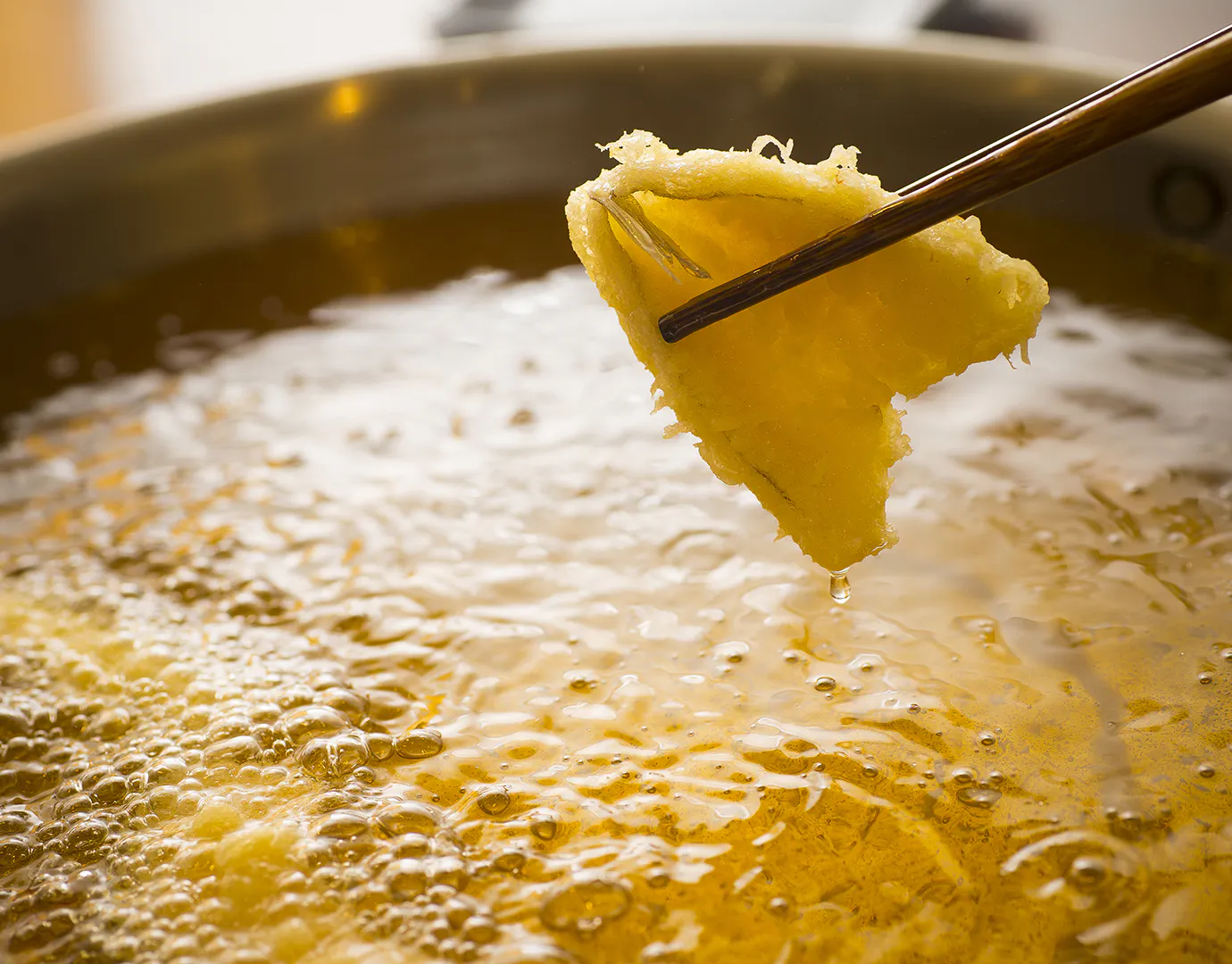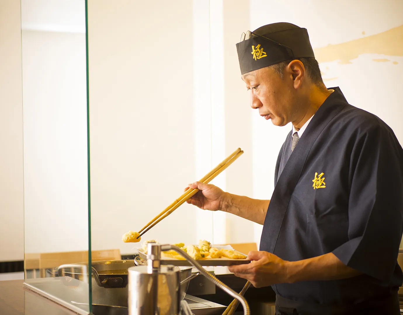 極神楽はカウンターで、お客様の目の前で揚げて提供いたします。