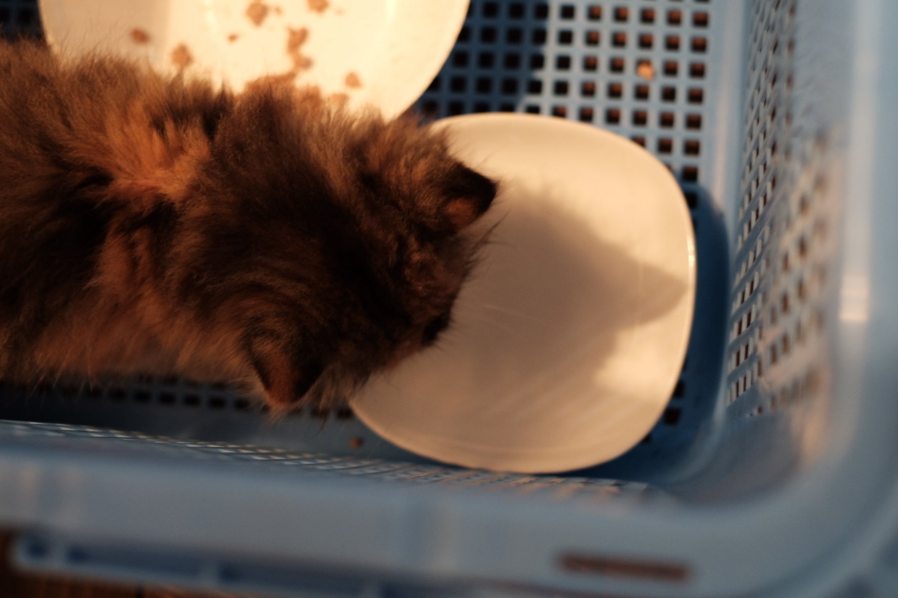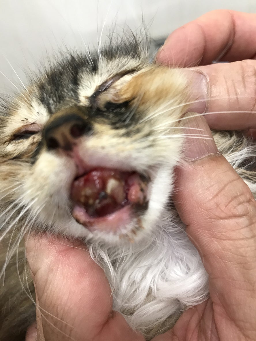 今は体力回復のため、ごはんをしっかり食べさせ、キズ口に細菌が入らないよう毎食ごとに口元の食べかすなどの汚れをとりながら様子をみている状況です。口元のケガにより、食べたご飯が傷口にくっついてしまいます。それを毎回キレイにしながら様子をみています