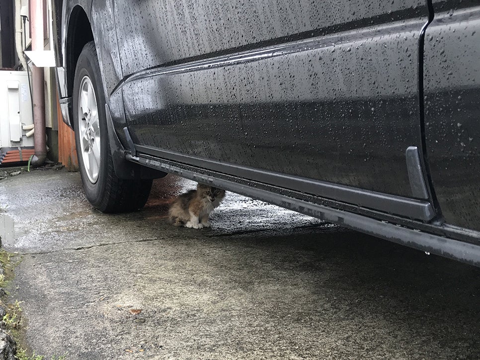 6月某日、その家の駐車場に車を駐め家に入ると、外から子猫の鳴き声が聞こえてきました。気になって外へ出てあたりを見回すと、自分の車の下にポツンと座っていたのです。駐車場に駐めた車の下で子猫が泣き続けていました