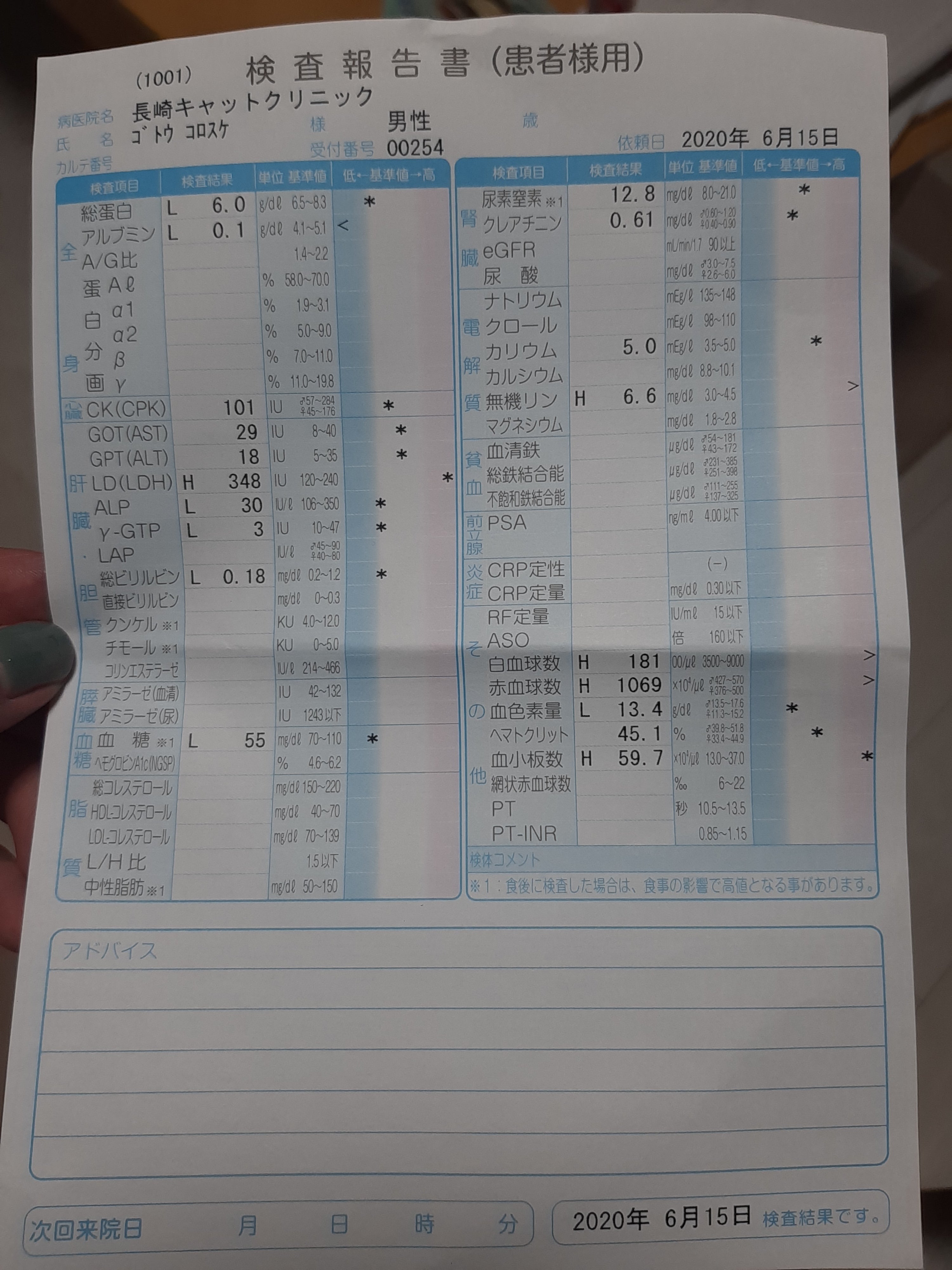 追記: FIP診断結果の用紙は口頭のみで結果を知らされた為まだ頂いておらず、画像データが添付出来ませんでした。