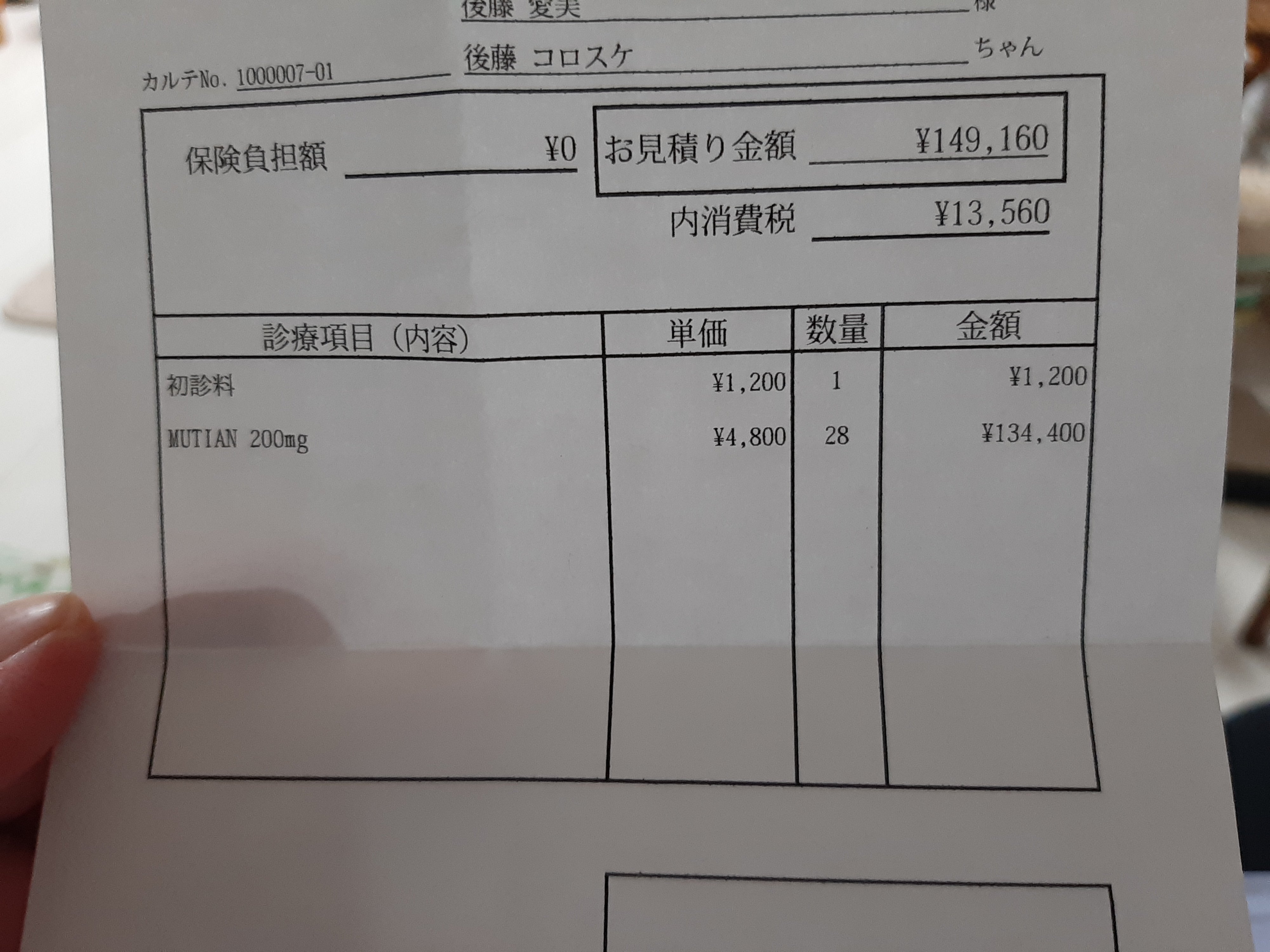 日本では認可されておらず、動物保険適用外であること、海外からの輸入品であることから、この薬での治療は非常に高額になります。