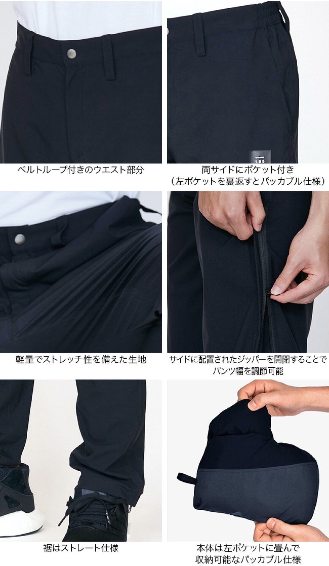 多機能で使い勝手の良いパンツとなっています。普段履きのパンツ、雨の日のレインパンツ、風の強い日の防風パンツとしてご使用頂けます。