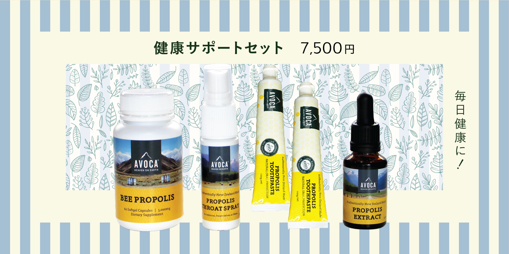 『AVOCA』アボカブランドの プロポリス5,000mgソフトジェル60カプセル、プロポリス喉スプレー、プロポリス歯みがき粉100gを2本、プロポリスエクストラクト25ml + 送料込み