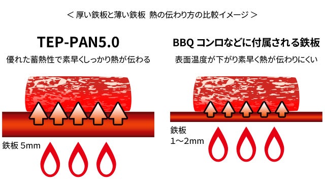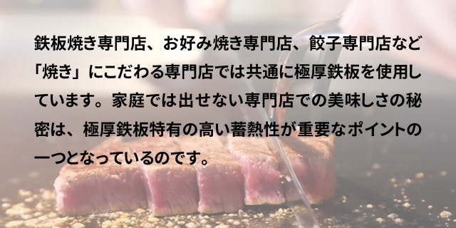 鉄板が厚いと蓄熱性が高まり、お肉をのせても焼き面の温度変化が少なく一定の熱を加え続けることができるので、よりムラなく中身に熱を通すことができます。