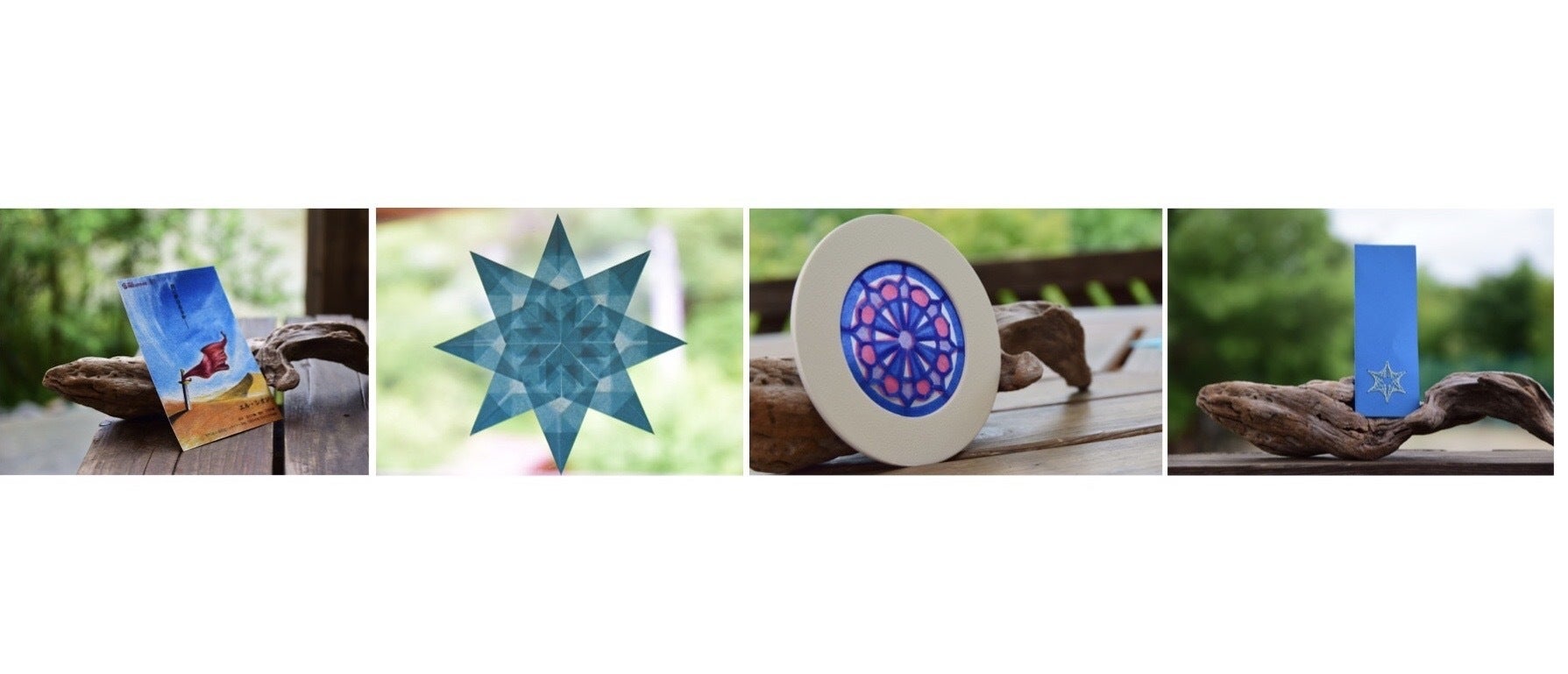 陽の光に透ける色紙を用いた装飾品です。光が差し込むと美しい幾何学模様が浮かび上がります。窓に飾ってお楽しみください。