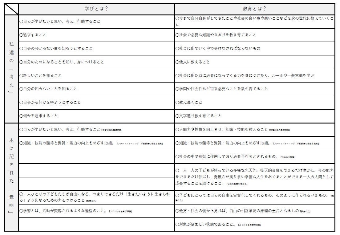 教育系大学への進学を希望する私たちは、今回、自分たちで考えたり、図書館の本で調べたり、先生方にアンケートをとりながら「教育とは何か」「学びとは何か」を考えてきました。