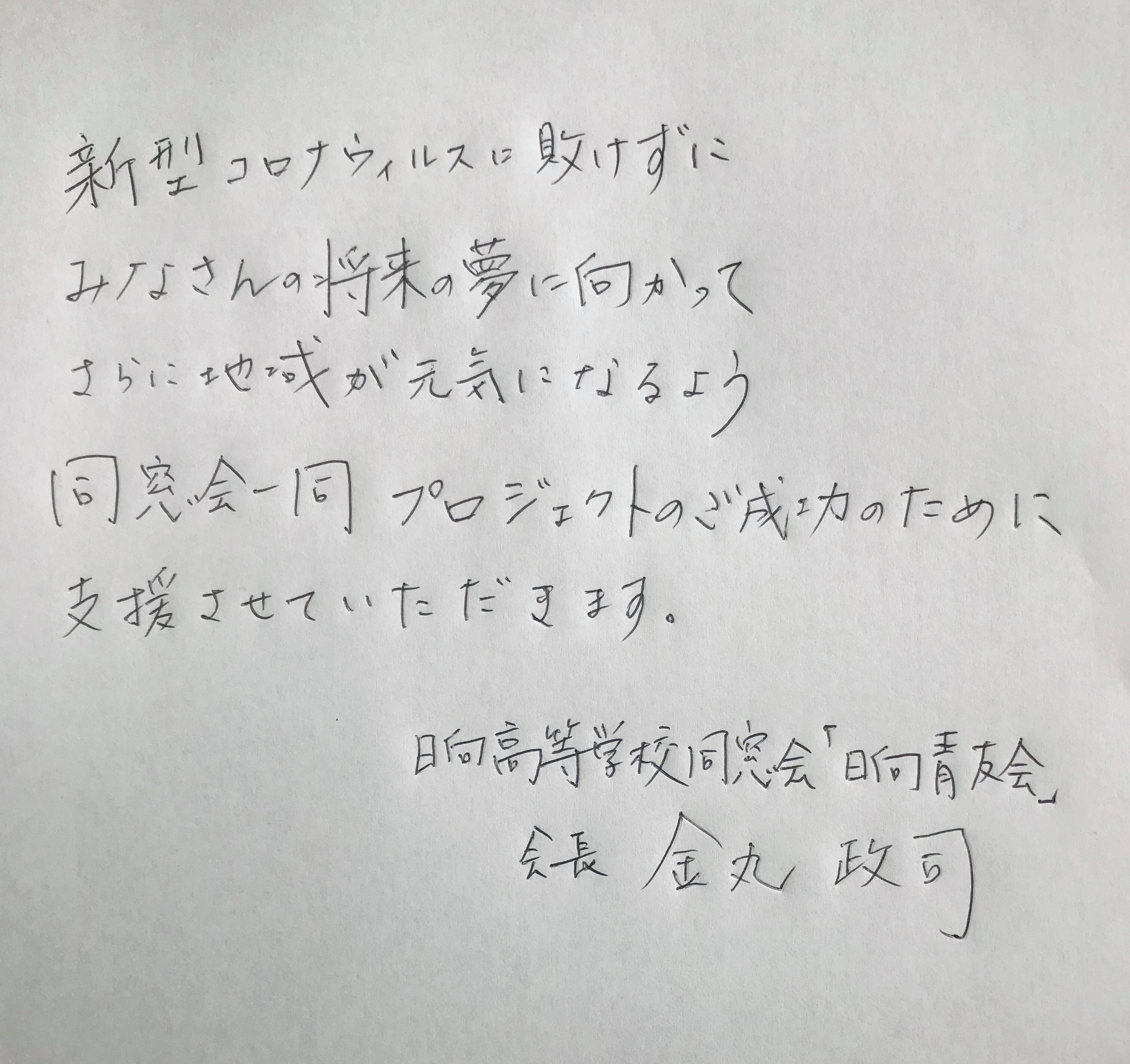 また、このプロジェクトが、春に卒業した生徒たちをはじめ日向高校を母校とするみなさんの励みになることを期待します。