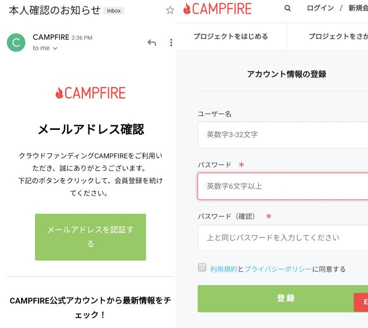 ③キャンプファイヤーより、アドレス認証のメールが届くので、”メールアドレスを認証する”をクリック。