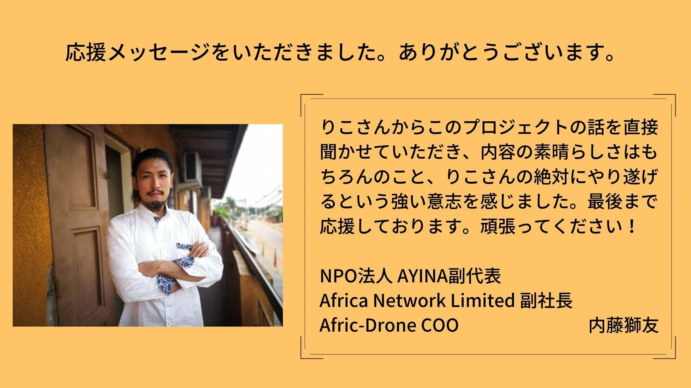 南アフリカに住んでいる知り合いの伴優香子さんを雇う形でこのプロジェクトを行います。
