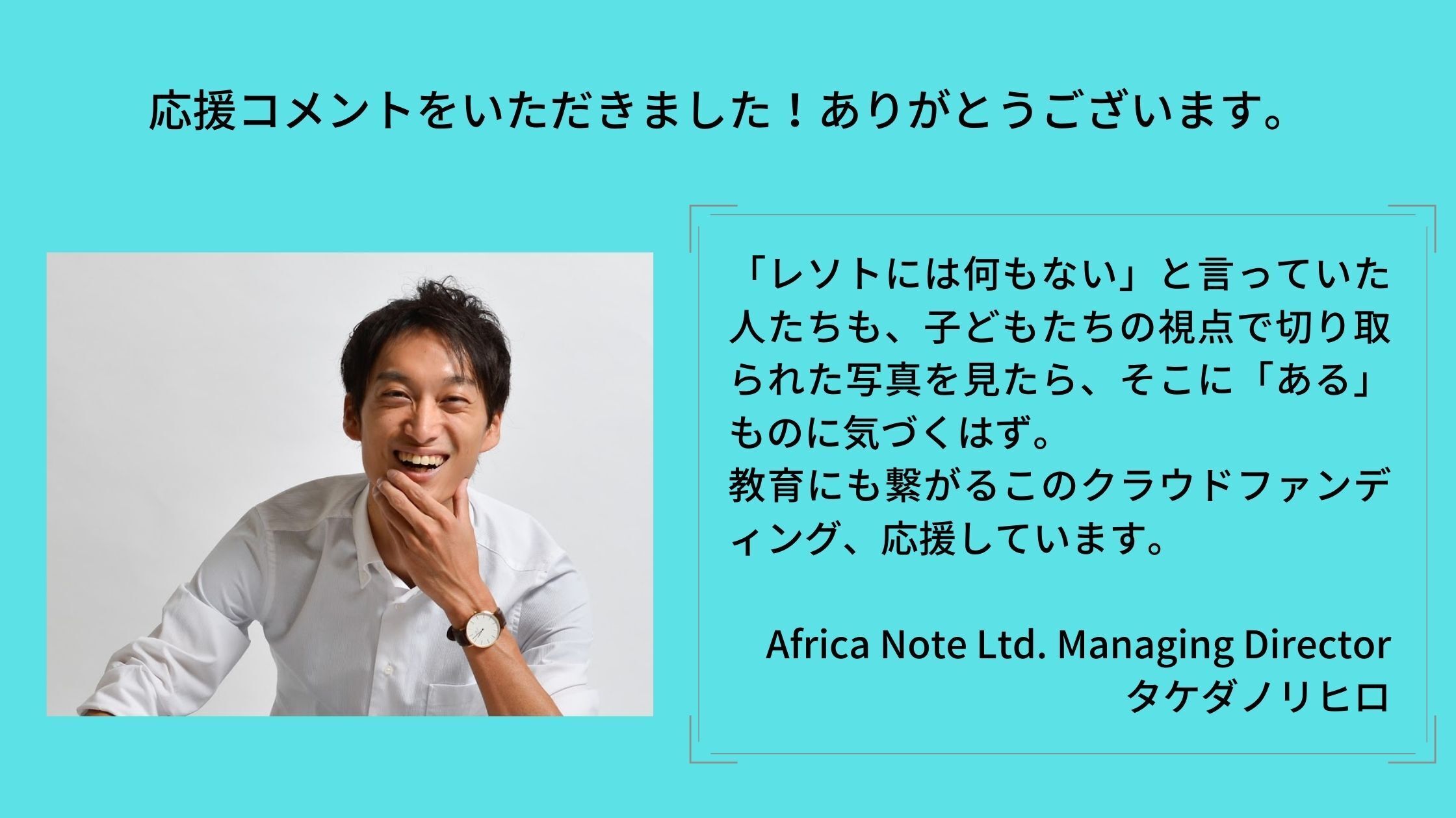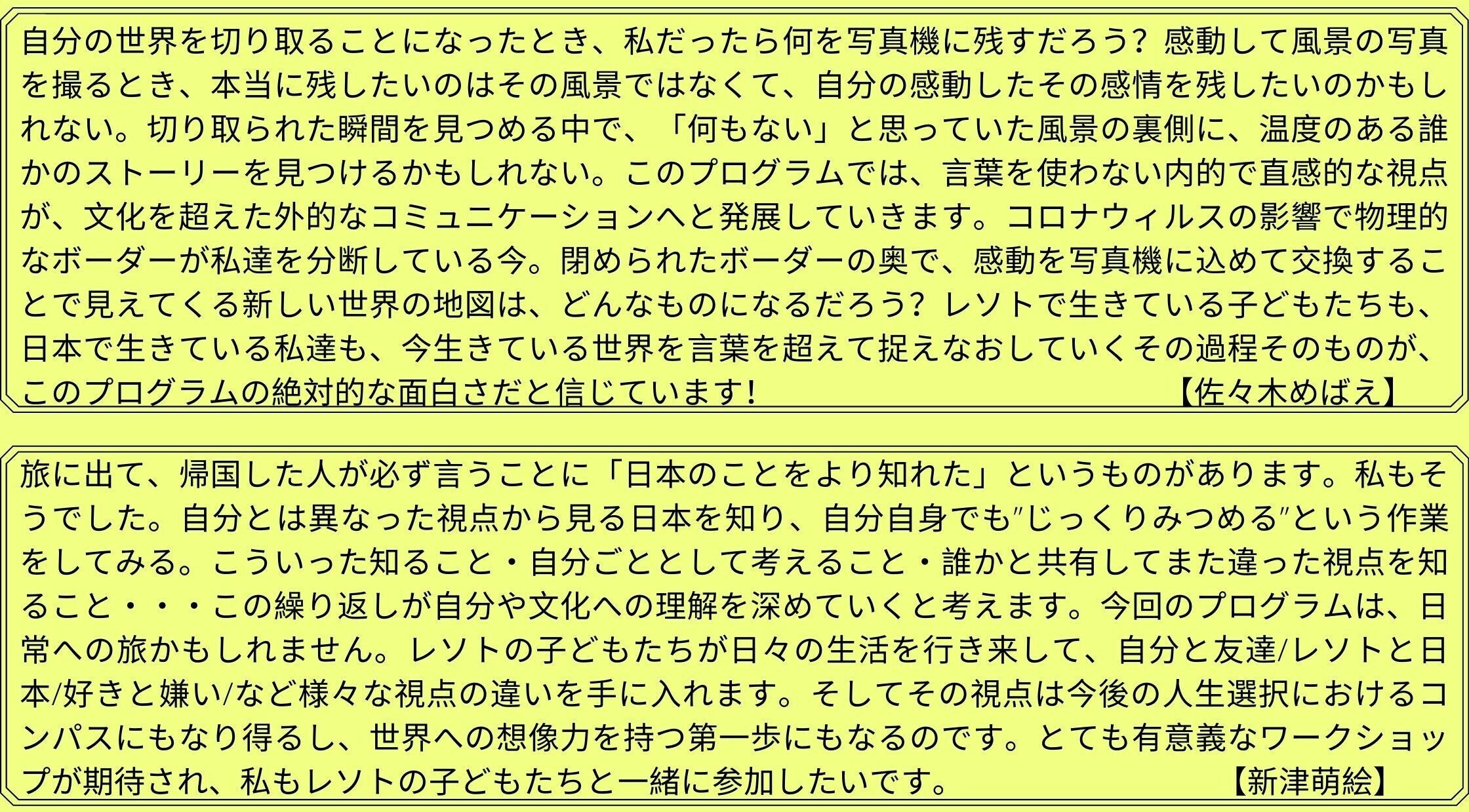 私は子どもの時からやりたいことがあれば両親がそれができるように応援してくれました。自分の興味の思うままに様々なことを体験でき、それが現在に繋がっています。写真を楽しそうに撮る子どもたちを見てこの子たちやりたい!楽しい!の部分を伸ばしたいと思いました。でも、ただカメラを渡すのではなく、カメラを撮ったり写真を見たりすること自体が子どもたちの学びに繋がるような教育プログラムを提供します!