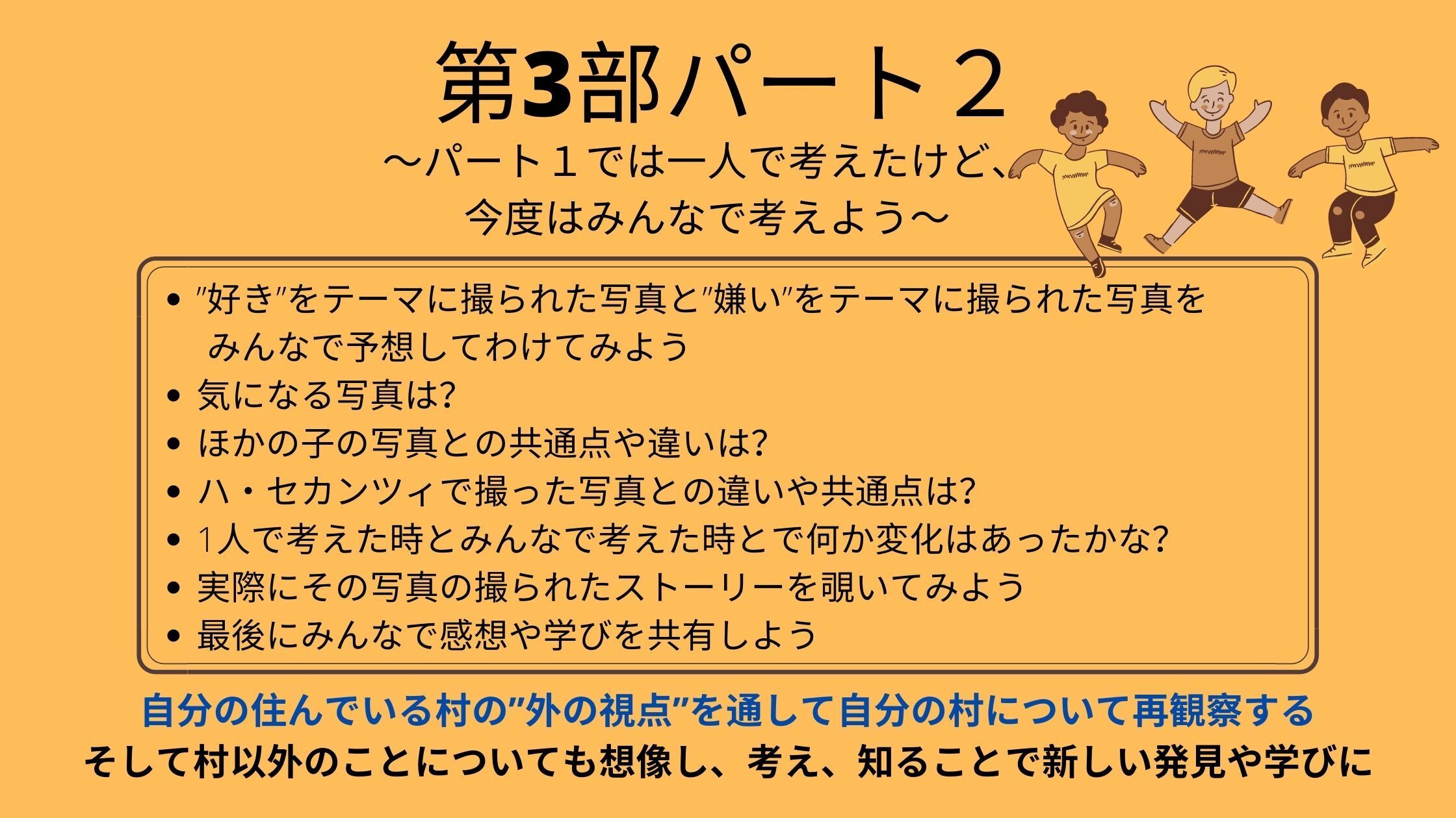 ・村には学校がなく、子どもたちは往復4時間かけて学校へ通っている。→天候によって学校へ行けるかどうかが左右されたり、登下校中に犯罪に巻き込まれたりすることもある。