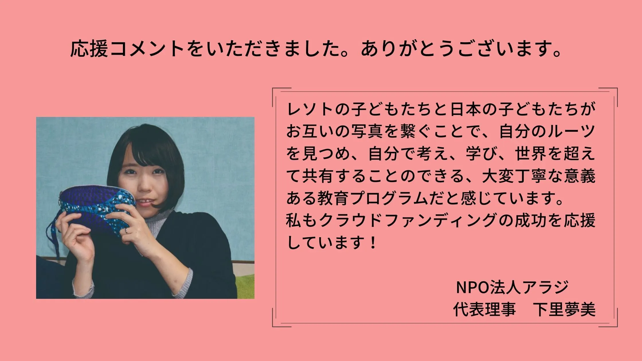 今日は西アフリカにある国、シエラレオネを舞台に活動を行っている下里様よりいただいた応援コメントを紹介させてください。