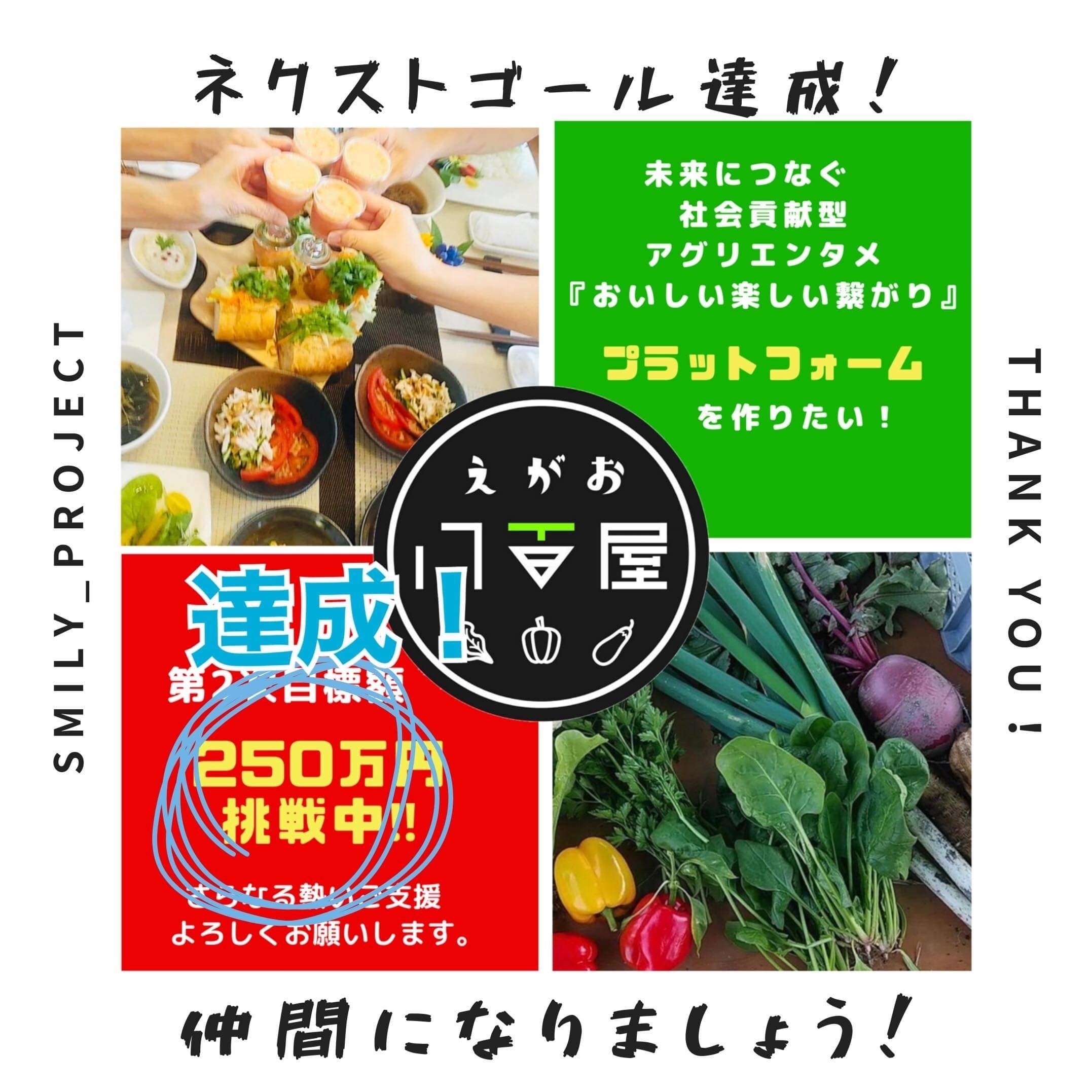 2020/07/23 07:49第1目標 150万円を達成し、【 SUCCESS 】となりました。クラファン開始して2週間目前での達成です。みなさまのご支援のおかげです。本当にありがとうございます(*ᴗˬᴗ)⁾⁾ペコでも、ココで終わりではありません!これからネクストゴールの250万円を目指して、さらに頑張っていきたいと思います٩(ˊᗜˋ*)وクラファンリターンには会員になれるリターンもあります。★月額1000円の会員(リターンだと年会費12000円でのご登録)さんにはお野菜+薬膳の先生からのレクチャー+オリジナル手拭い付き*^^*★月額3000円の会員(リターンだと年会費36000円でのご登録)さんにはお野菜+薬膳の先生のオンライン料理教室(&そのまま飲み会♡)+オリジナル前掛け付きです*^^*おいしい楽しいつながりアグリエンタメ「えがお八百屋」のプラットフォームをつくるため、引き続き、ご支援をよろしくお願いします( ⁎ᵕᴗᵕ⁎ ) もっと見る