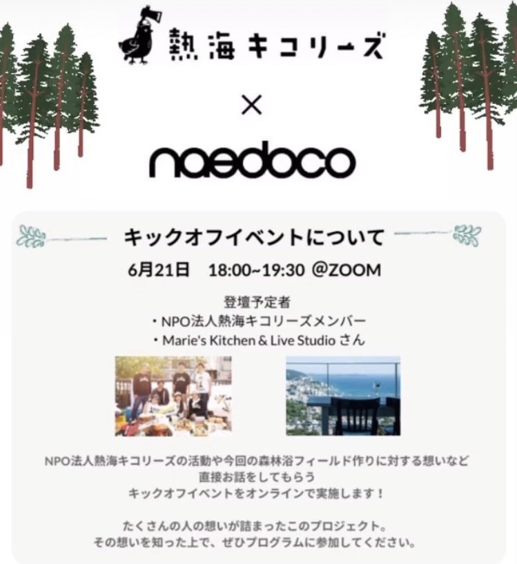 6/21(月)18:00-19:30に【naedoco】 -atami collaboration workplace 様とコラボで「森林浴フィールド づくりの裏話や今後の話を大公開!」オンラインイベントやります!みなさまと一緒につくる、森づくりプログラム2021」も大発表させていただきます。