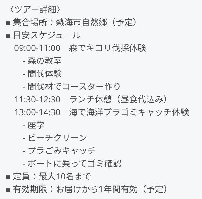 海から環境問題を解決しようと活動する「未来創造部」と、森から環境保全に取り組む「熱海キコリーズ」との、初のコラボSDGs体験研修を、このクラファンのために共同開発いたしました。SDGsに関する研修などを検討している団体・企業様向けの体験研修プログラムです。自然を満喫しながら、学びたいというファミリーやご友人との団体様にもおすすめです!