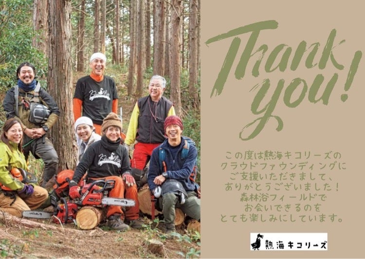 みなさまのアツい応援のおかげで、熱海キコリーズ初のクラファン、#森林浴フィールドづくり挑戦中 『"超"ネクストゴール』も達成することができました!予想を大きく超える大反響の中、今回のクラファンを終えることができて、心より感謝しております。みなさまからの応援メッセージ、シェア拡散、様々なお言葉・・・などに大変励まされました。---------------------------------------------------------------------<最終結果のご報告>◎ご支援者数・・297人◎目標達成率・・144%◎ご支援総額・・3,612,943円---------------------------------------------------------------------さぁここからがNEXTステージのはじまりです。今後とも活動報告にて、森林浴フィールドができていく過程をご報告させていただきます。熱海キコリーズSNSでも情報を随時発信中ですのでぜひ「いいね」「フォロー」いただけますとうれしいです!◆facebook : https://www.facebook.com/atamikicollys◆Instagram:https://www.instagram.com/atami_kicollys返礼品リターンは、順次お送りいたしますのでお楽しみにお待ち下さい。末永く、引き続きよろしくおねがいいたします!熱海キコリーズ一同