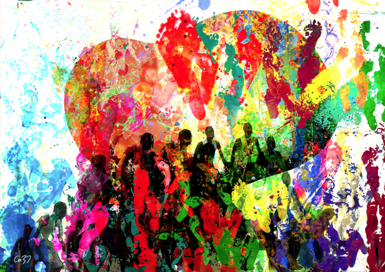 2017/10/03 21:31パトロンの皆様、こんばんは。今回のプロジェクトテーマでもある「アチョリ族の民族ダンスの足跡アート」が完成しましたので、真っ先にご披露します。 実際の画像はプロジェクト実施報告ページにアップします。 踊り手となったのは、元子ども兵はじめ、アチョリ族出身の南スーダン難民の子どもたち、また生活支援を受けている地域の子どもたちです。 タイトルは「平和の足音」。ダンスの楽曲である、アチョリ族の打楽器や踊り手が発するお囃子、また踊りを踊る目的である「求愛・平和への祈り」をテーマに制作しました。彼らの踊るシルエットは私のスケッチから。また筆で荒々しく塗ったようなタッチは全て彼らの足跡ペイントを活かしています。 彼らはこの民族ダンスの練習を通じて、アチョリ族としてのコミュニティ形成と継承を図っているとのことです。この辺は12月までに編集公開するインタビュー動画でご紹介します。 以下は原画となった足跡ペイントと実際のダンス動画の一部です。 <完成作 「平和の足音」> <実際に使用した足跡ペイントの一部> <民族ダンスの動画> もっと見る