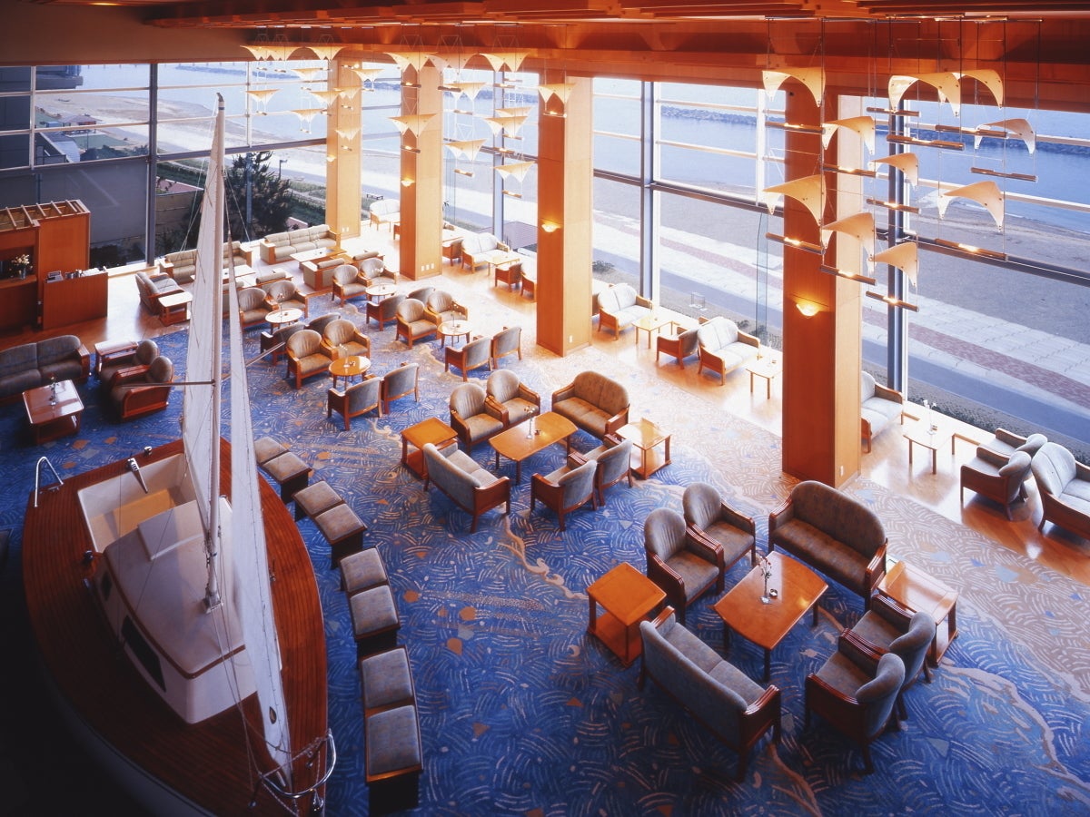 日本海を一望できるロビーラウンジ。大きなガラス窓の向こうには水平線まで続く大パノラマが広がります。