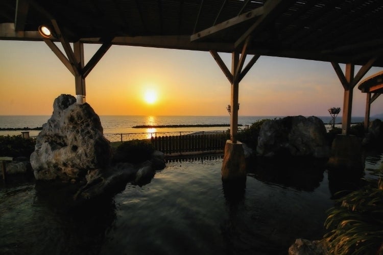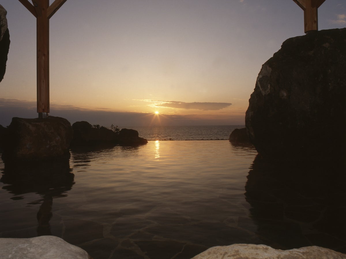 夕陽が湯面に溶け込む渚の露天風呂で、潮騒を聞きながら至福の時を…