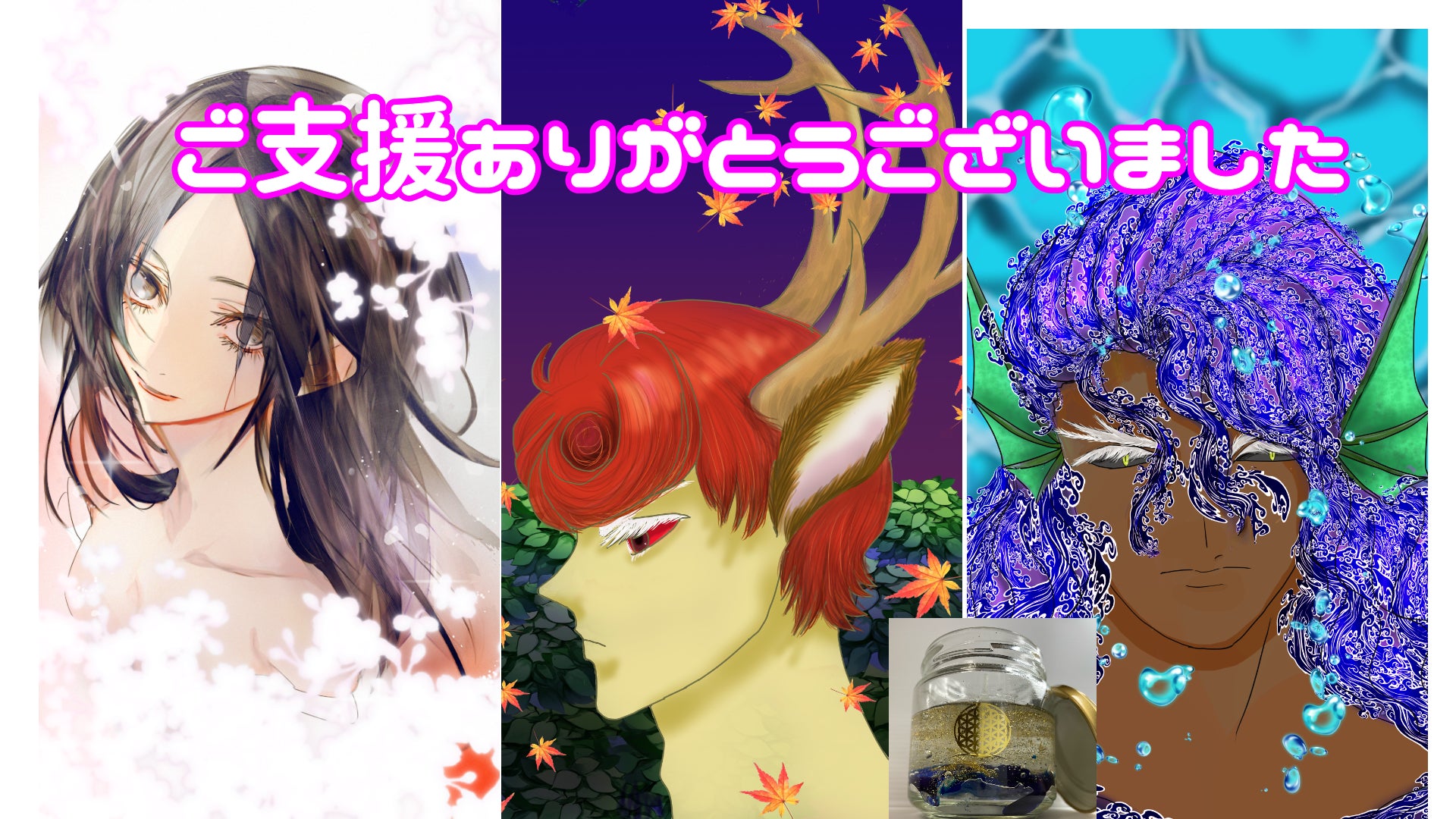 この度は目標まで行きませんでしたが、応援してくださった方には本当に感謝しております。底辺Vtuber の私ですがこんなのでも応援してくださる方がいてくださり、本当にありがたい気持ちでいっぱいです。いつかバズって底辺の時に支援したことあるんだーと自慢していただけるよう精進したいと思います。本当にありがとうございました。※イラストはお守り壁紙になります。恋愛運の木花咲耶姫 、開運の山幸彦、金運の海幸彦で全種類リターンとしてお渡しさせていただきます。あと、画像が1枚しか載せれないのでサンプルのアロマキャンドルの写真も載せます。少しキャンドルの元が足りませんでしたが送らせていただくキャンドルはもっと容量は多くなります。