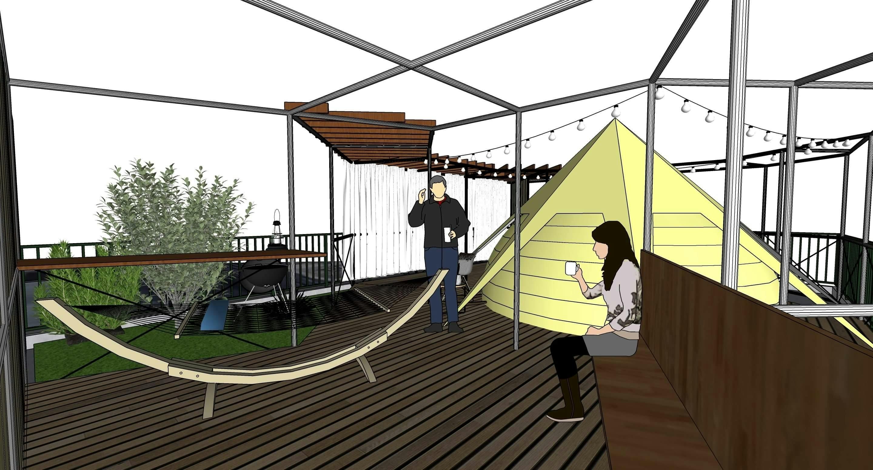 建築現場の足場などで使う単管を活用して、強風が吹いても飛んでかない形にデザインされてます。周りからの視線が気にならないように、カーテンなどで開閉ができるしつらえを想定しているのと、照明や植栽なども雰囲気あるものにして、非日常感を演出していきたいと思っています。