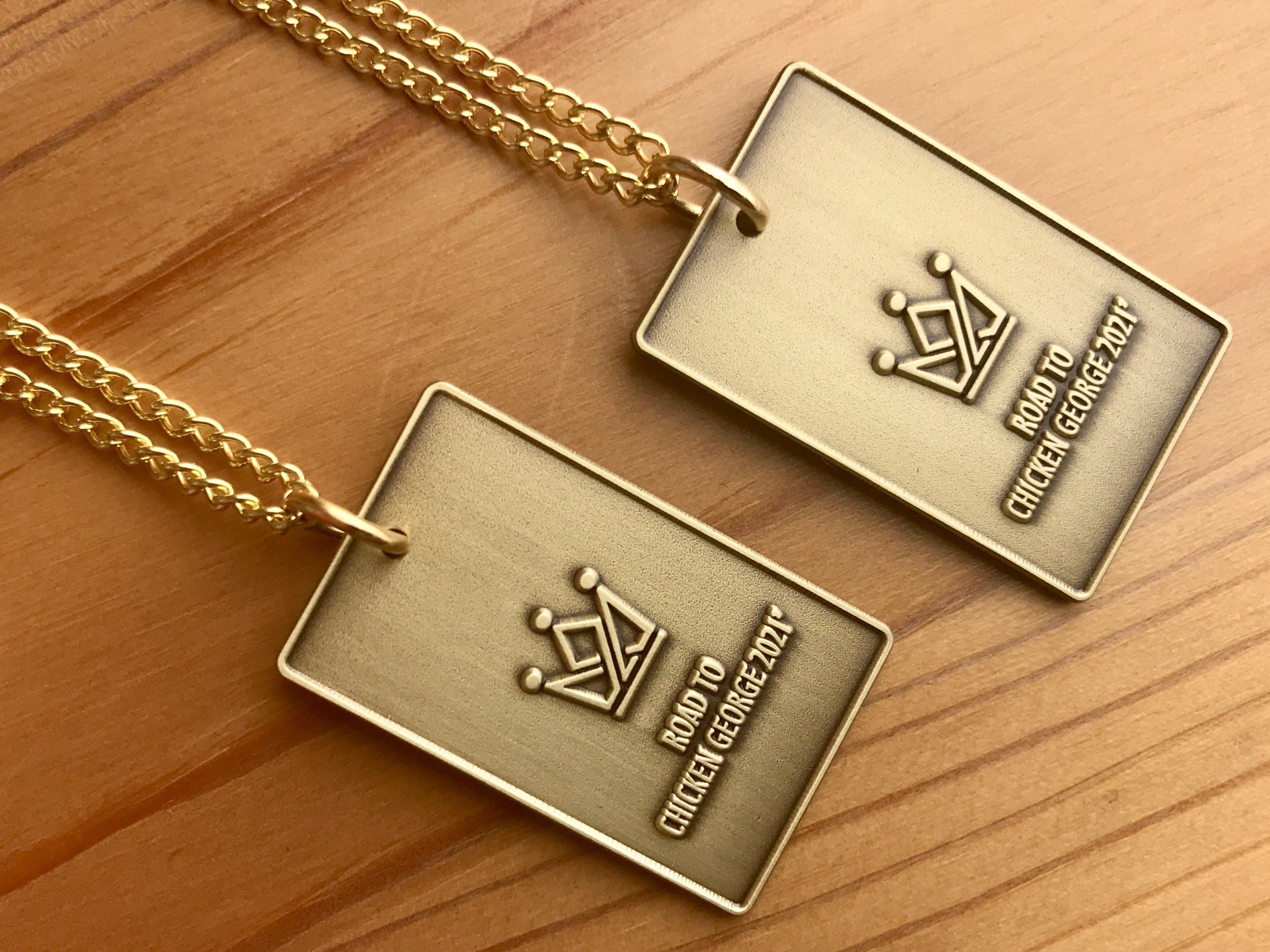 ROAD TO CHICKEN GEORGE 2021'オリジナルペンダントトップの、サンプルが出来あがりました!想像以上のとてもステキな仕上がりです。王冠と文字のロゴマークは彫り込みではなくエンボス加工となり、縁取りされて雰囲気のあるデザインに。(写真サンプルはゴールドのチェーンとなっていますが、実際はカラーを合わせたブロンズ色ボールチェーンを付属してのお届けです。)王冠のこのデザインにはいろいろな思いや意味が込められました。みんなの思いと力が集まってできた素晴らしい作品です。ぜひ手に入れてくださいね!