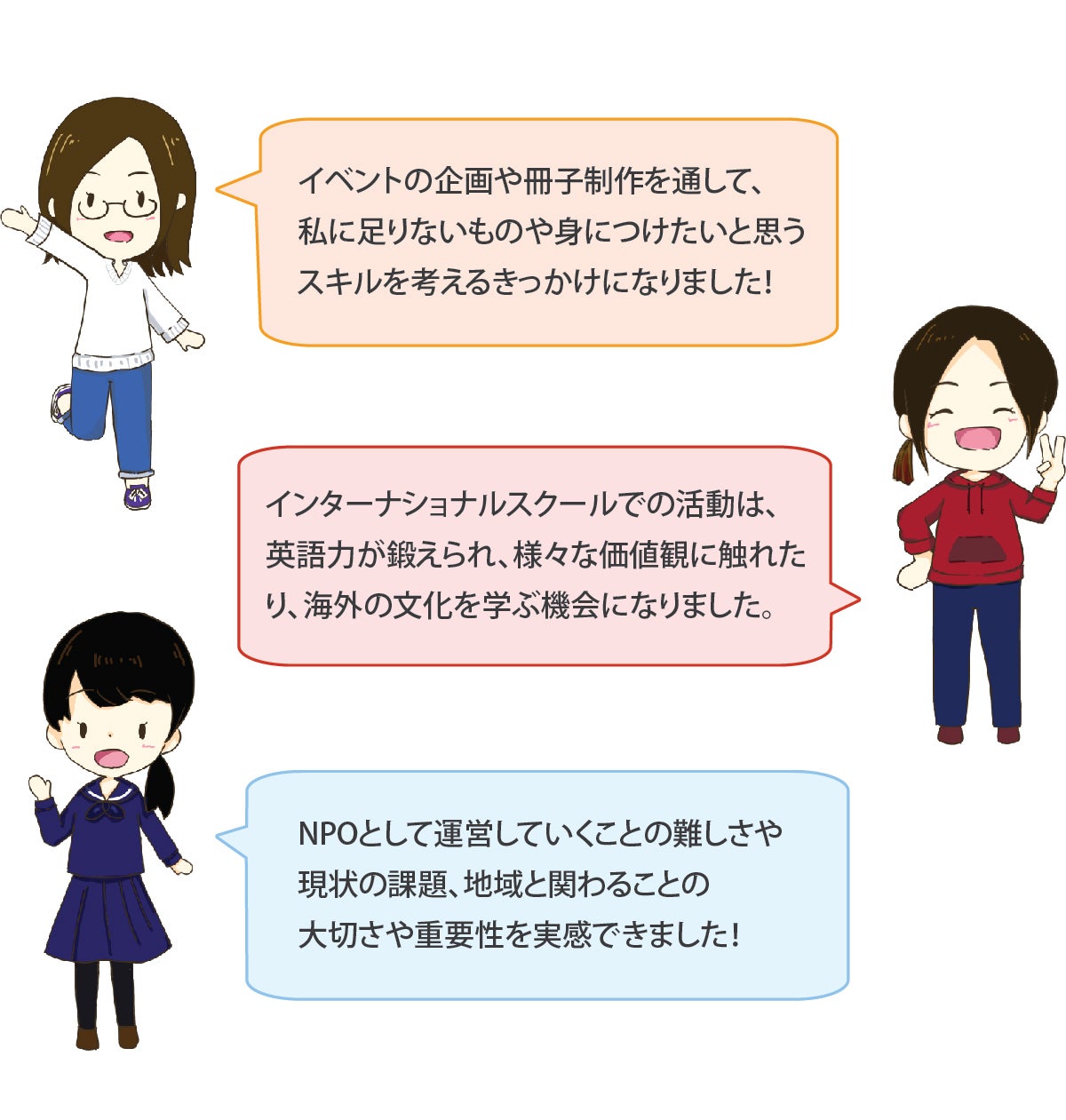 また、地域のNPO団体もワカモノを受け入れたことで、ワカモノの違った考え方や新しい価値観に良い刺激を受けた、という団体が多くありました。ワカモノとNPOが相互的に成長できる活動になったようです。