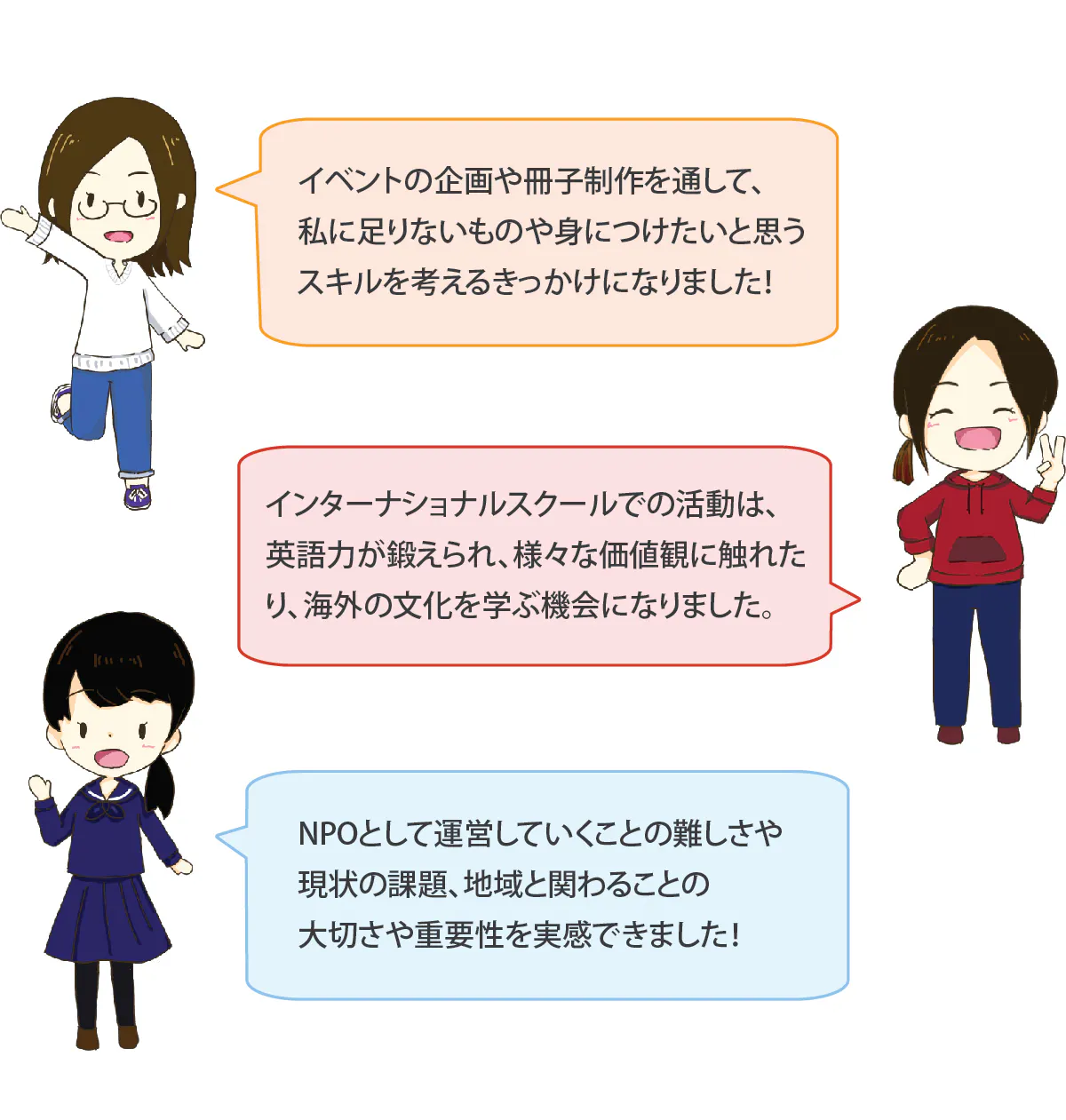 これらの他にも、ワカモノ一人一人がそれぞれの目的を持って参加しています。例えば、「NPOについて学びたい!」「積極性を持ちたい!」「将来やりたいことを見つけたい!」「地域のお手伝いをしたい!」など、各自が目的を持ってこの活動に参加しています。
