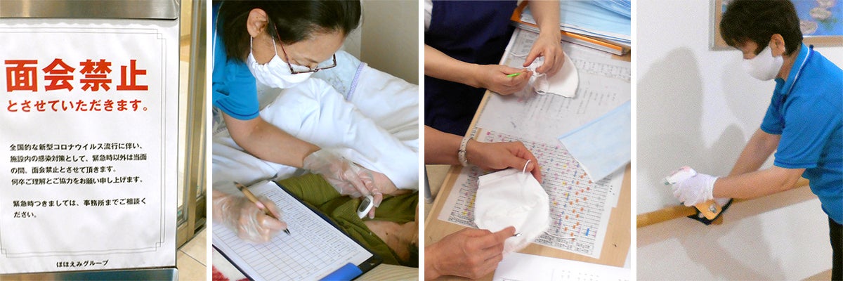 コロナウイルスの影響で、入居者の方の外出は禁止になり、ご家族との面会も禁止となりました。職員である介護士、看護師、事務員など関係者の不要不急の外出自粛はもちろん、自宅での検温と出社と退社時の検温報告。